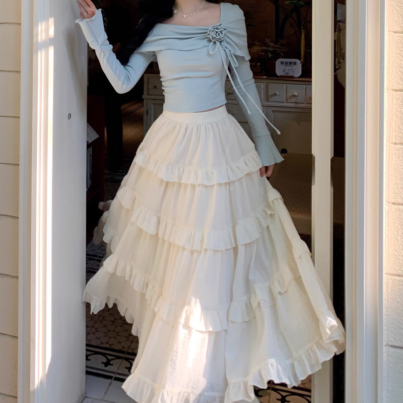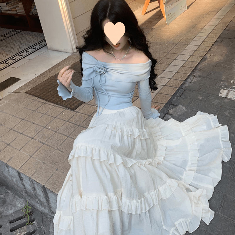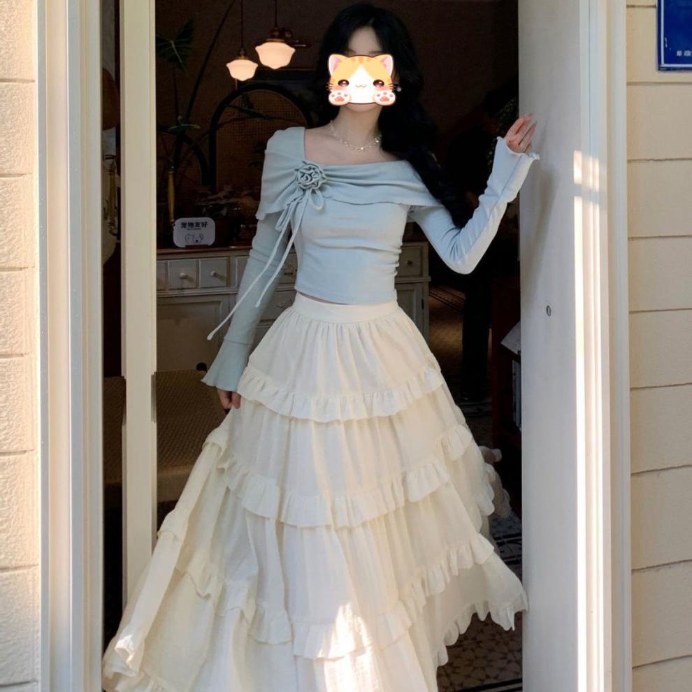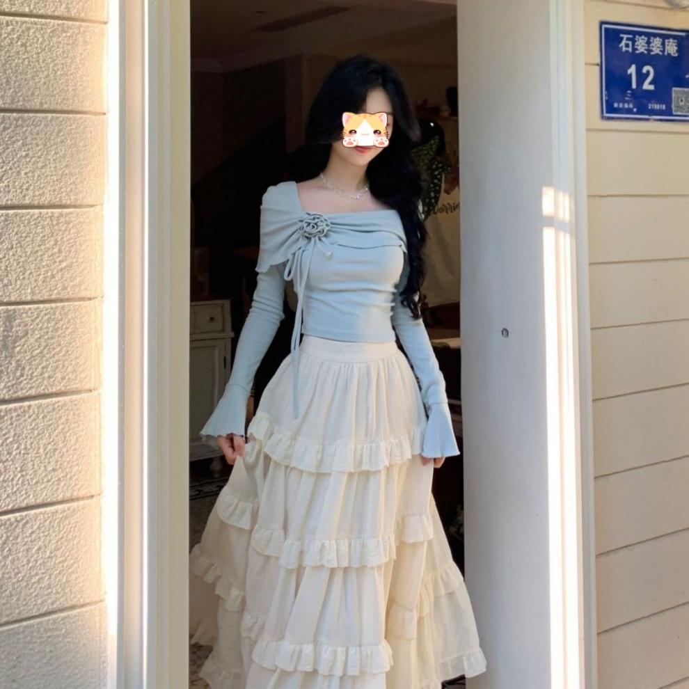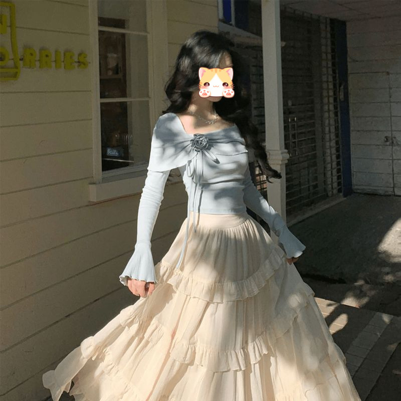 昙花未满 气质蓝色立体小花修身显瘦设计感方领针织上衣+半裙套装
