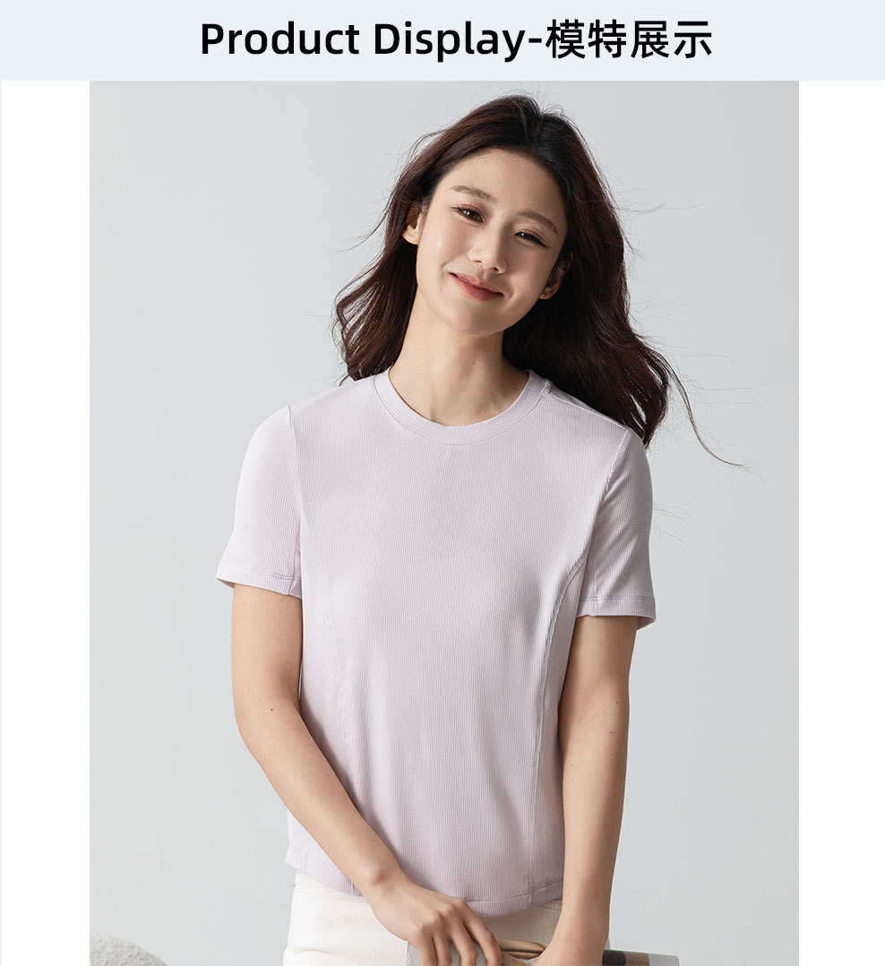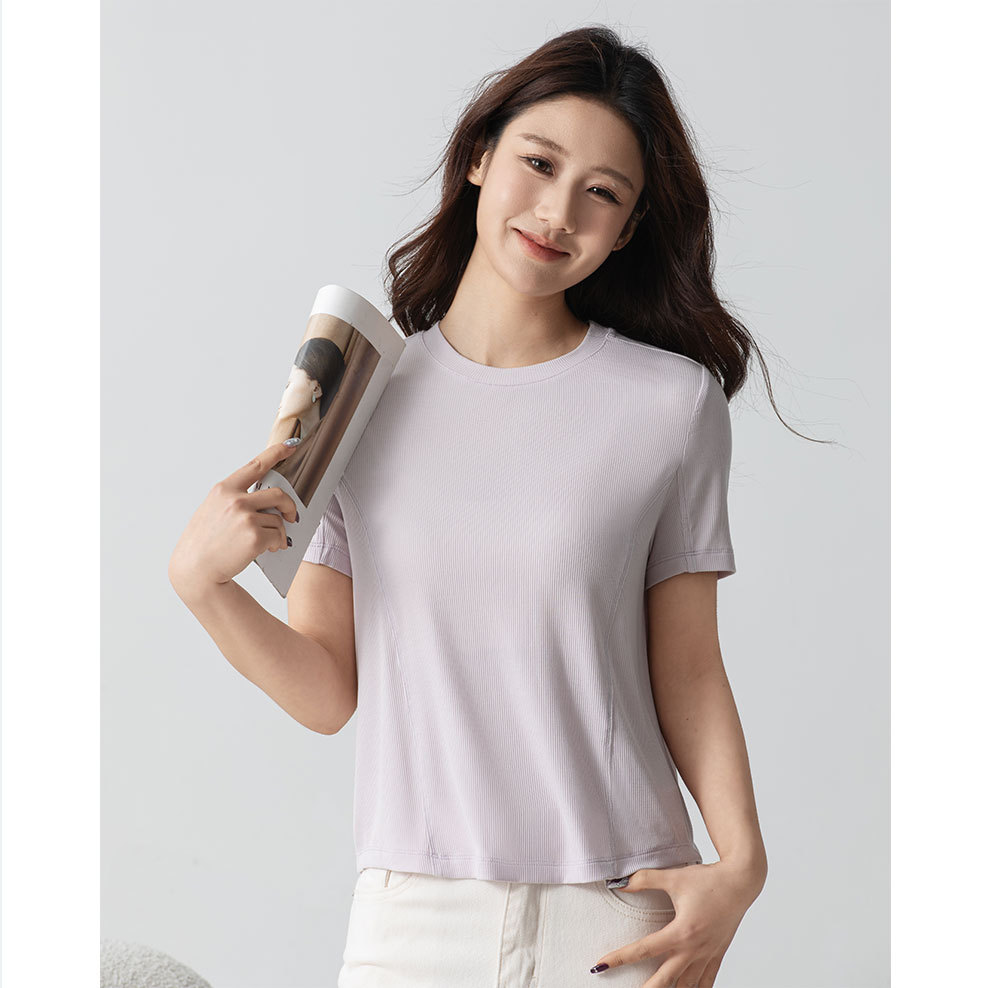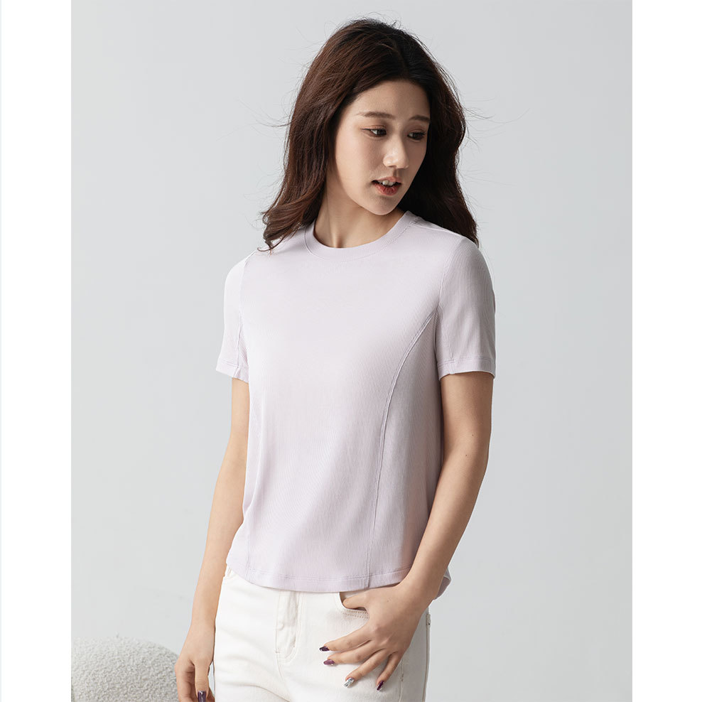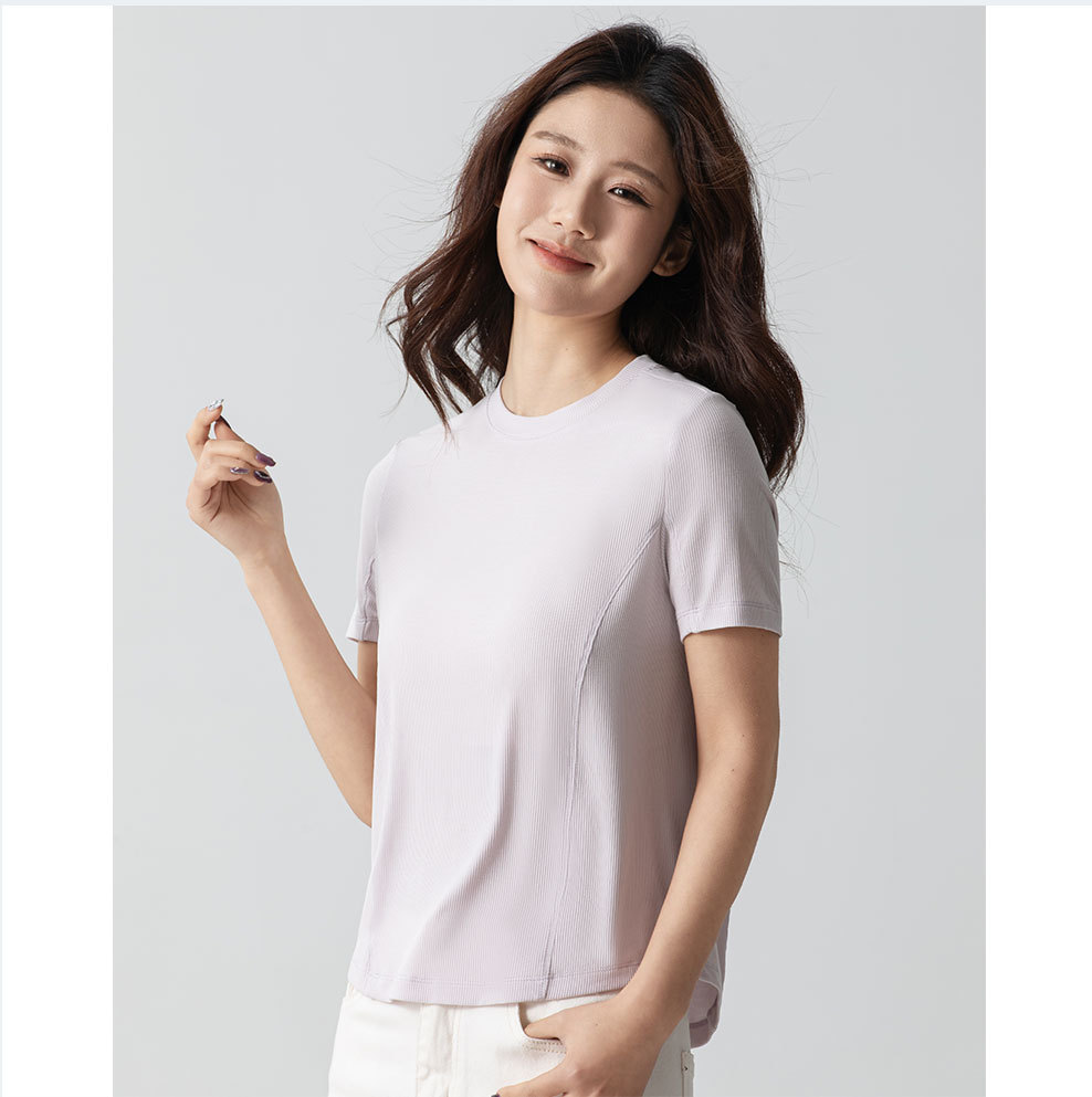 新商品のライゼル涼感リブ半袖tシャツ女性の肩の立体折れ線が痩せているアーチ形の上着L879