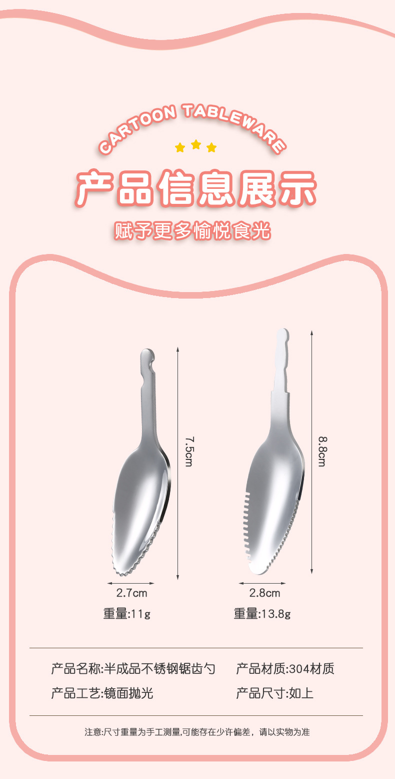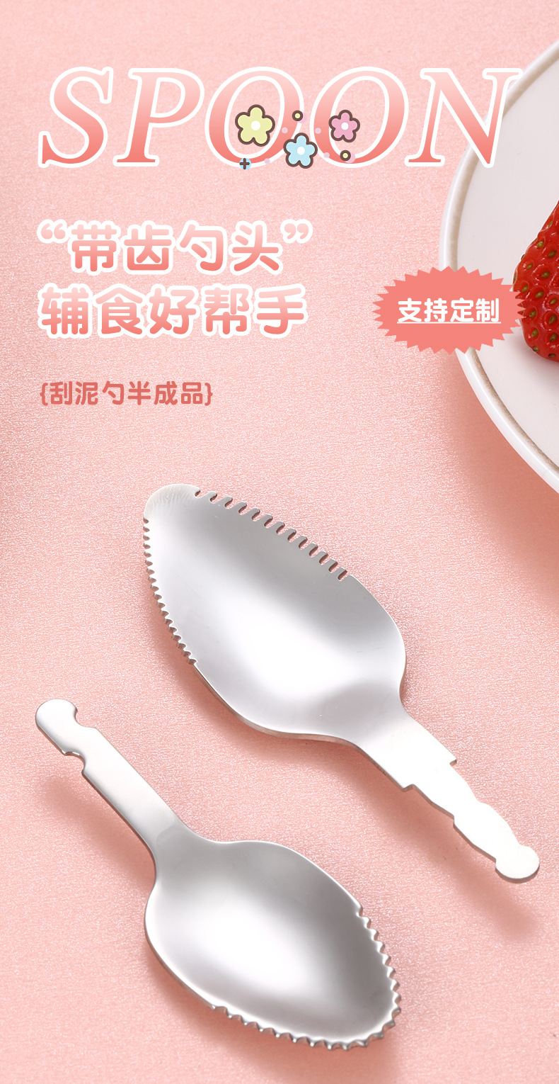 カスタマイズされた 304 ステンレス鋼の歯付きスプーン、フルーツ粗粒スクレーパー、子供用食器、半完成スプーンヘッドの加工