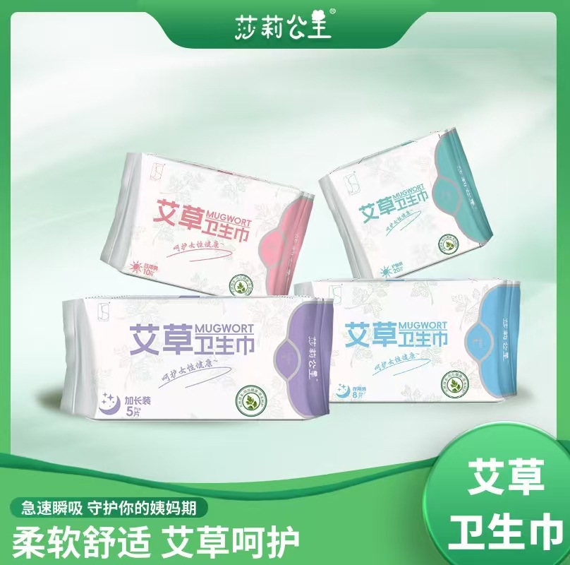艾草卫生巾莎莉公主抑菌养护源头工厂超薄亲肤棉柔姨妈巾整箱批发