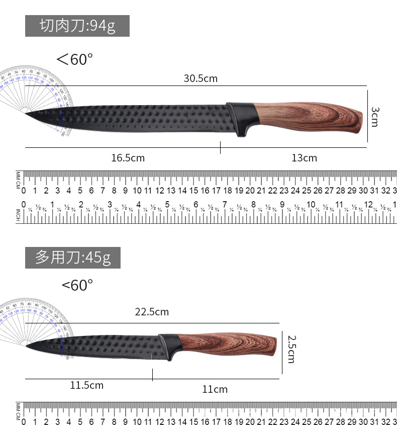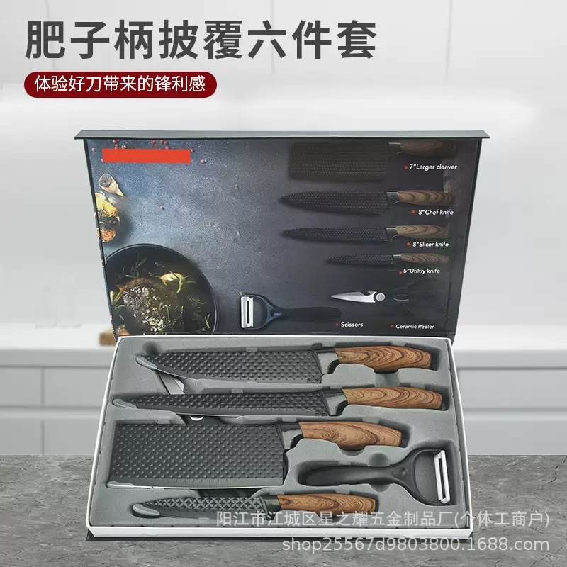 亚马逊热销不锈钢厨房刀具套装肥仔披覆木纹柄六件套礼品盒装批发