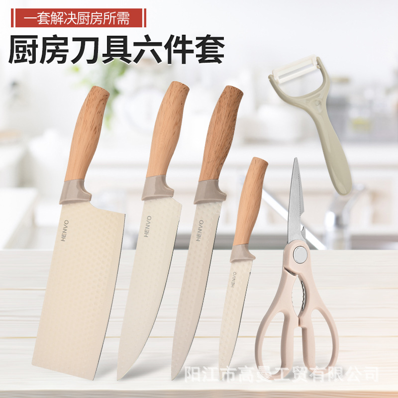 跨境刀具套装肥仔柄木纹披覆六件套厨房套刀带瓜刨彩盒装现货批发