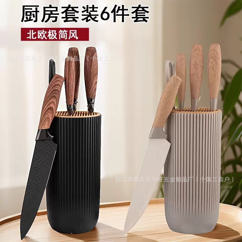跨境现货不锈钢刀具套装六件套披覆肥仔柄不粘厨房刀具圆筒座套装