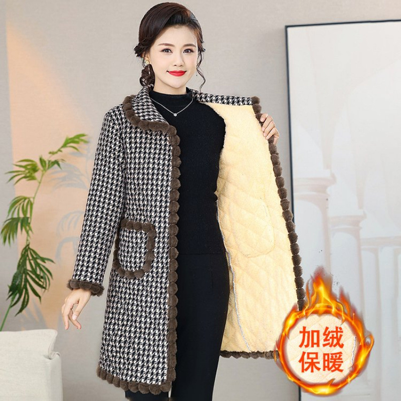妈妈冬装中长款格子加绒棉衣外套中老年女装洋气翻领加厚保暖棉袄