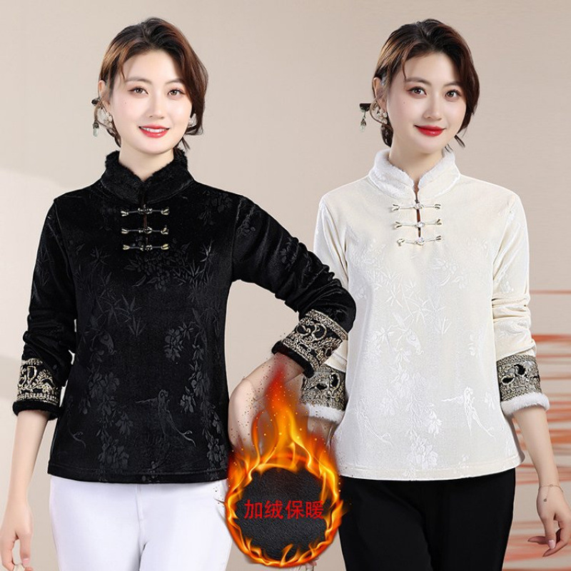 中年妈妈新中式国风立领盘扣加绒保暖上衣女长袖高级感内搭打底衫