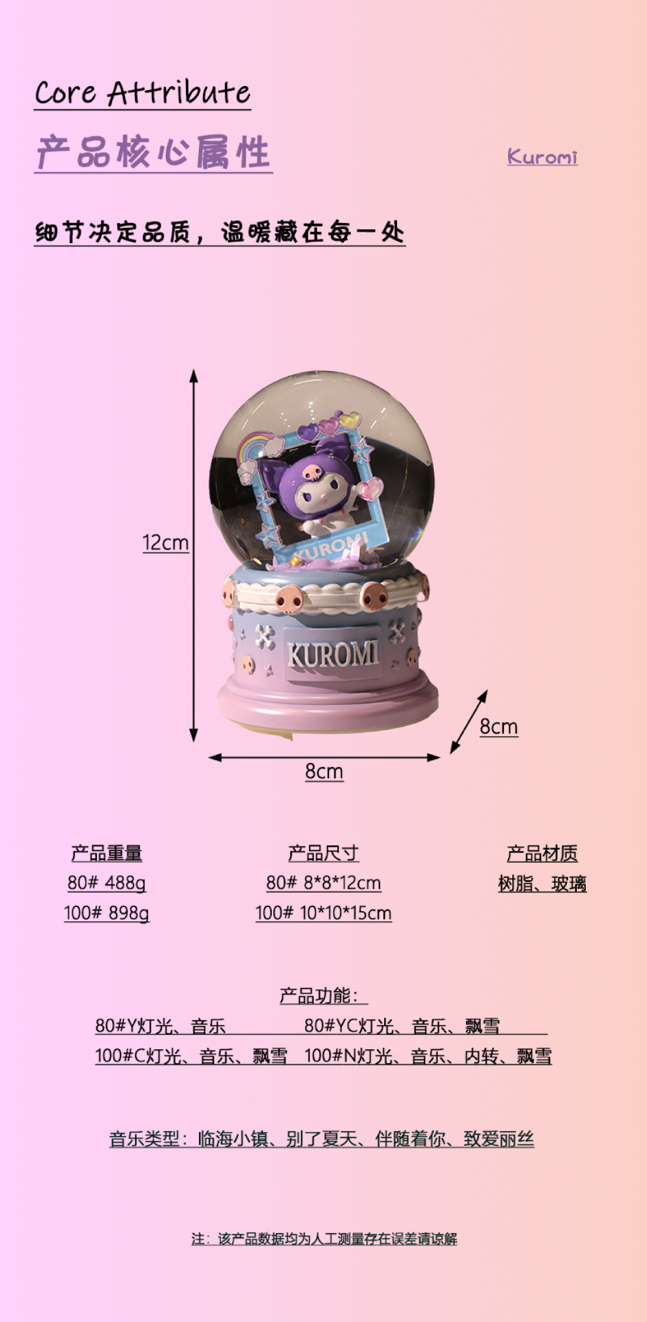 サイズ 8*12cmY (手回し雪+光+音楽),8*12cmYC (自動降雪 + 照明 + 音楽),10*15cmC (自動降雪 + 光 + 音楽),10*15cmN (内部転送 + 自動降雪 + 照明 + 音楽)