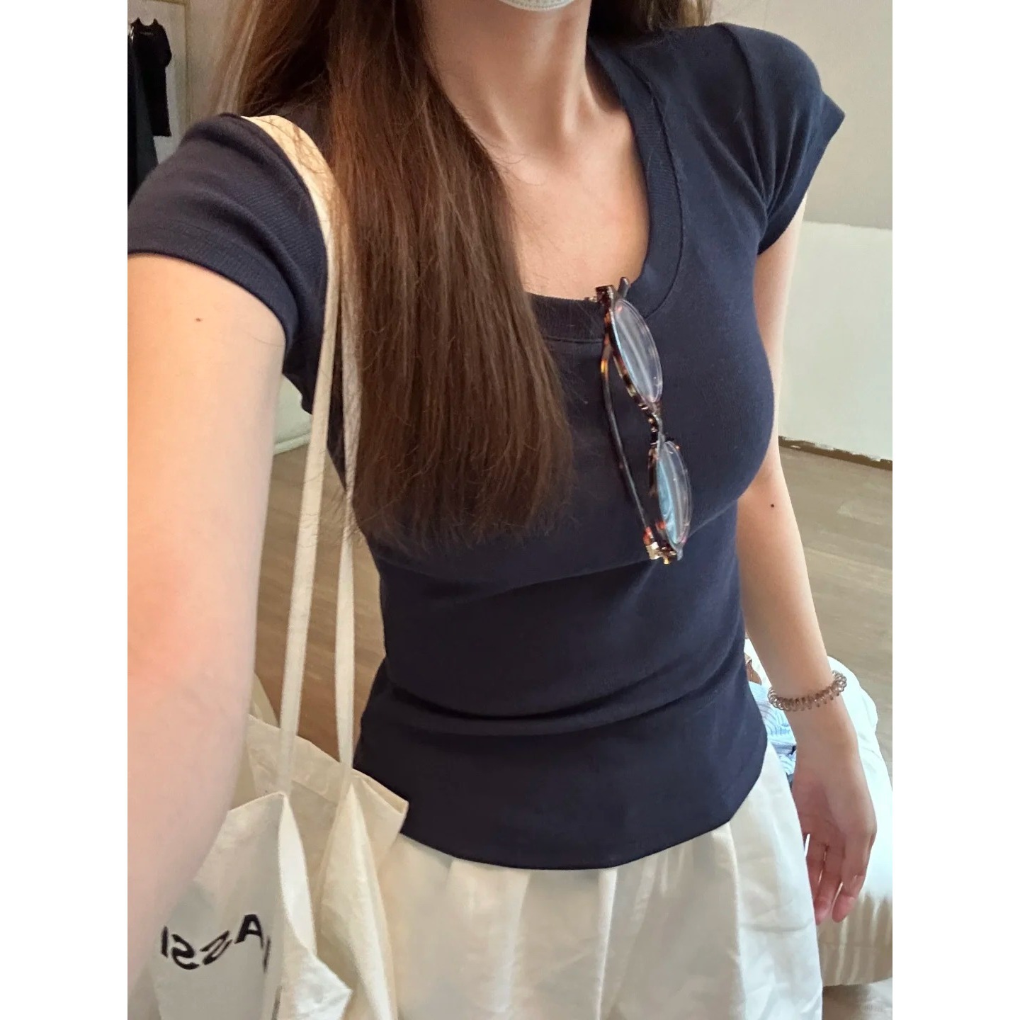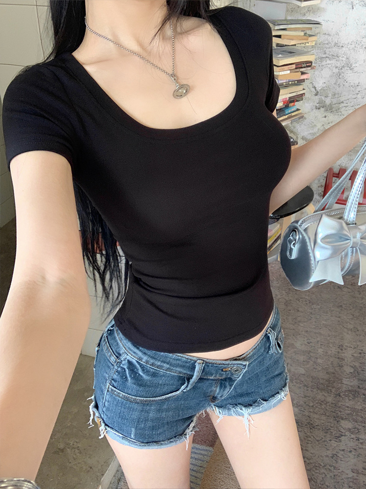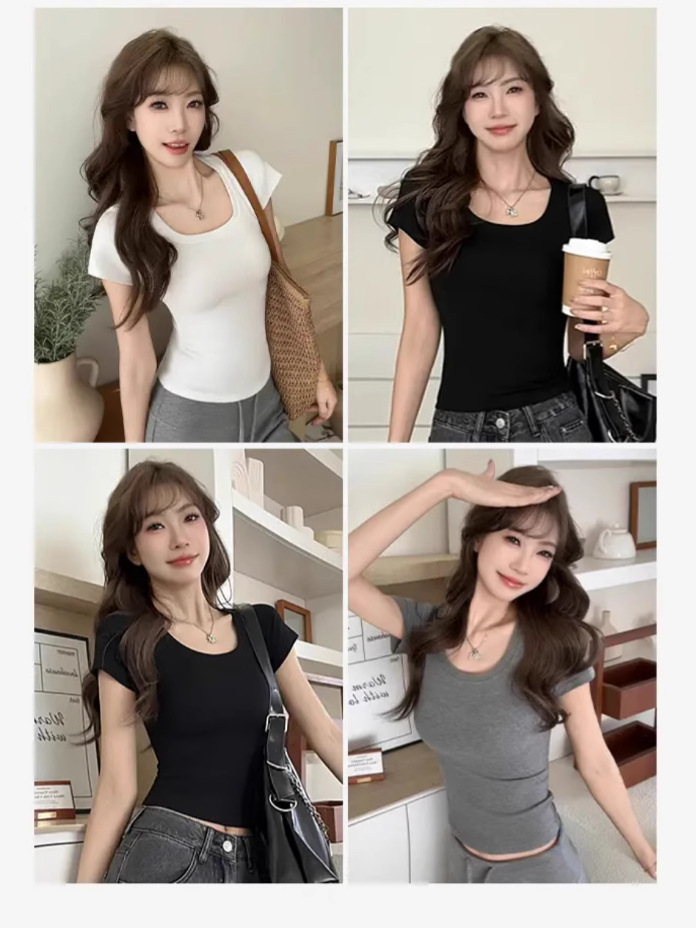正肩u襟修身低襟白色半袖tシャツ女性夏2025内にシャツのガードルをかける