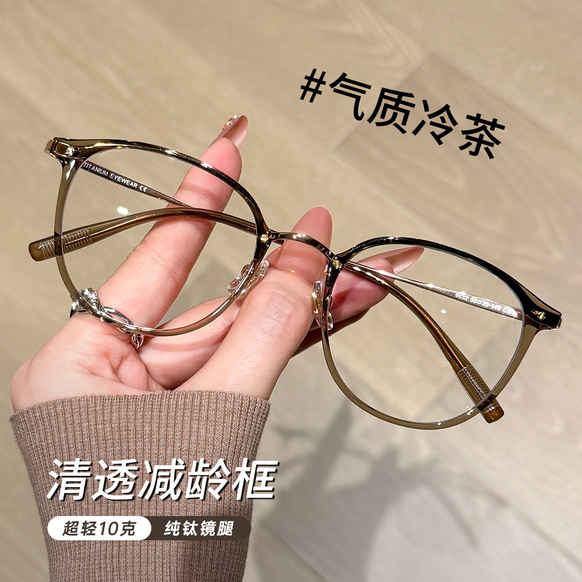 超軽量純チタン製小フレーム楕円形メガネフレーム、茶色の近視メガネ、女性用、度付き対応、高度数対応、丹陽製メガネ