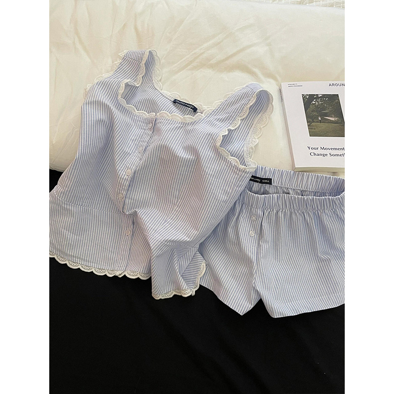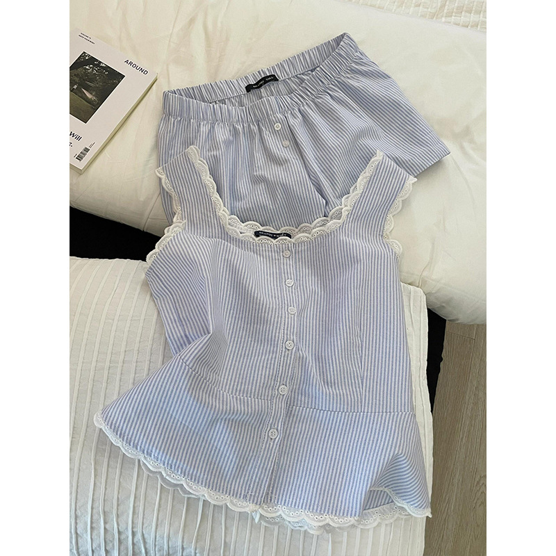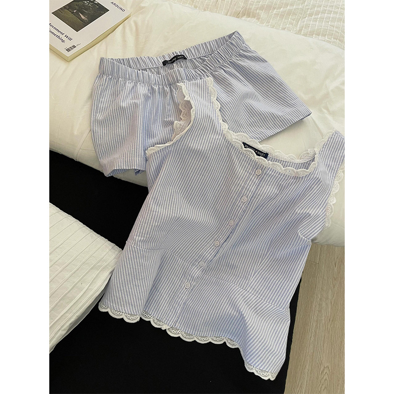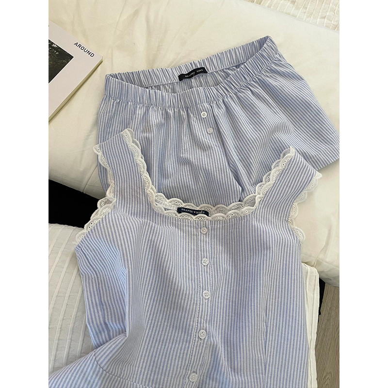韓国系ブルーストライプ純欲レースパジャマ女性用夏キャミソール半ズボン快適家庭服セット