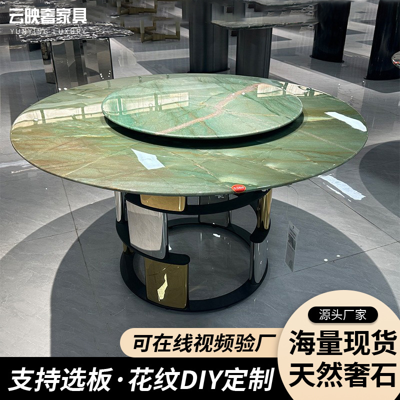 巴西天然奢石百达翡翠圆餐桌带转盘高端别墅天然大理石圆形餐桌子