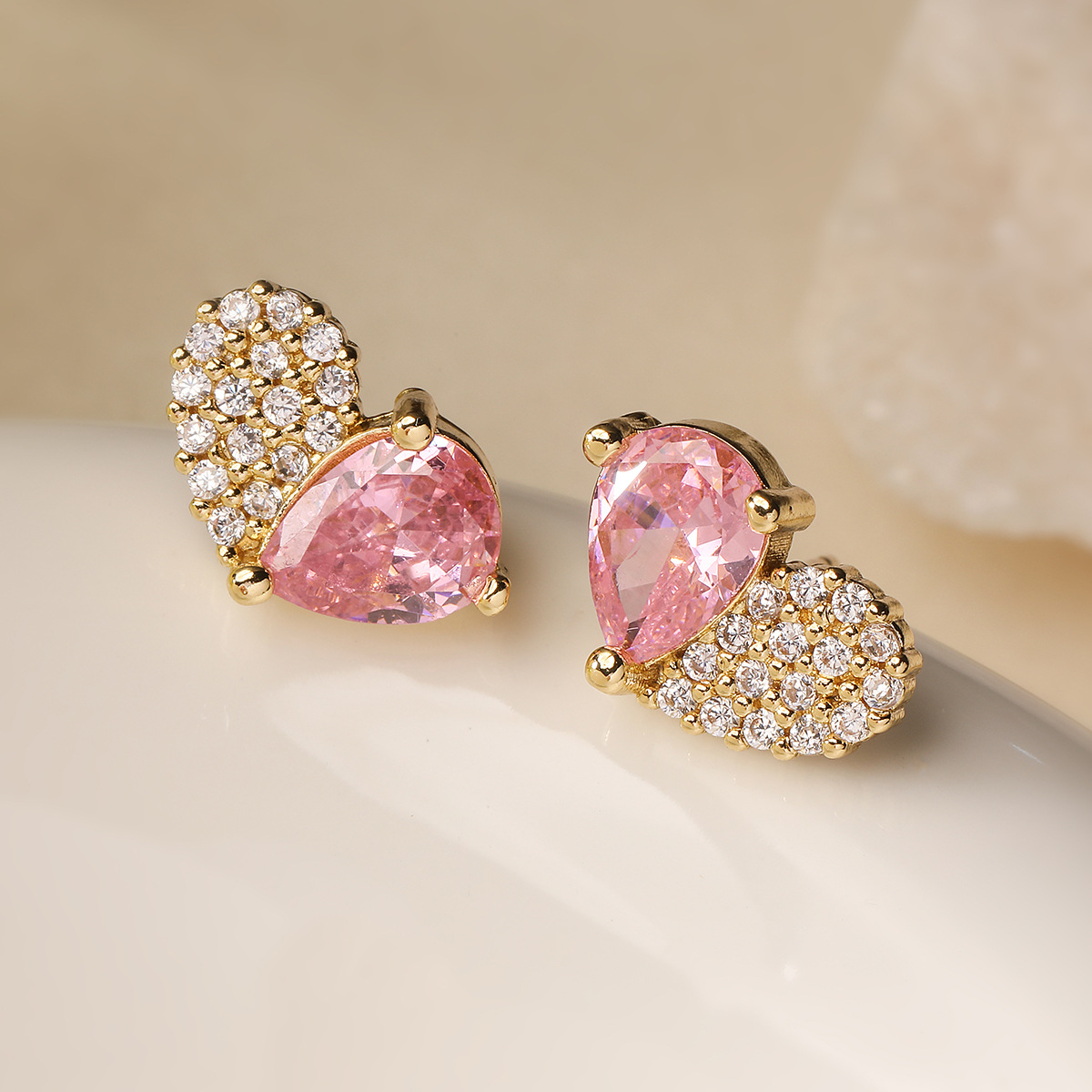 18k金ジルコン愛ピアス女性桃心クロスボーダー小衆精致耳飾りクロスボーダー人気ファッション軽豪華銅メッキ