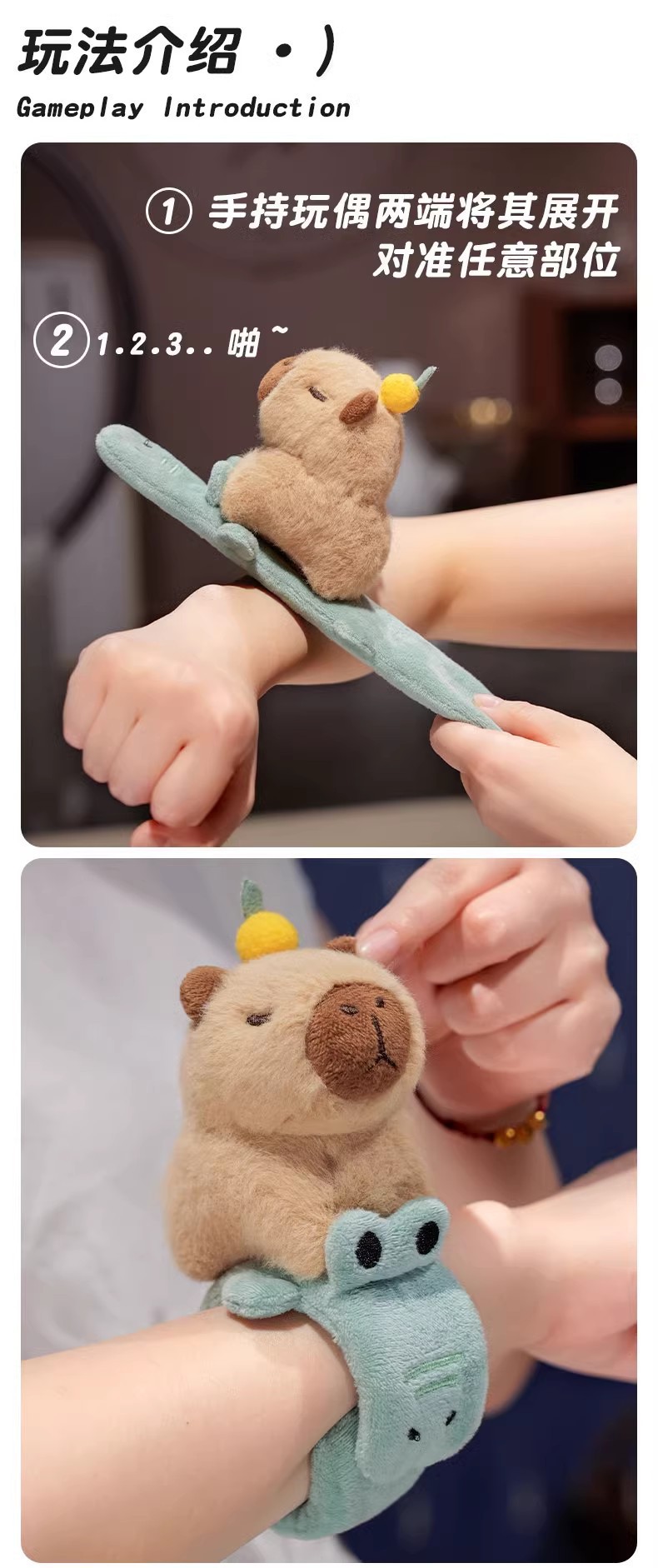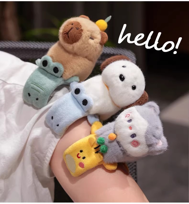 カピバラのパチパチとカピバラの人形の手環のぬいぐるみの女の子の子供の手首はうつぶせになります。