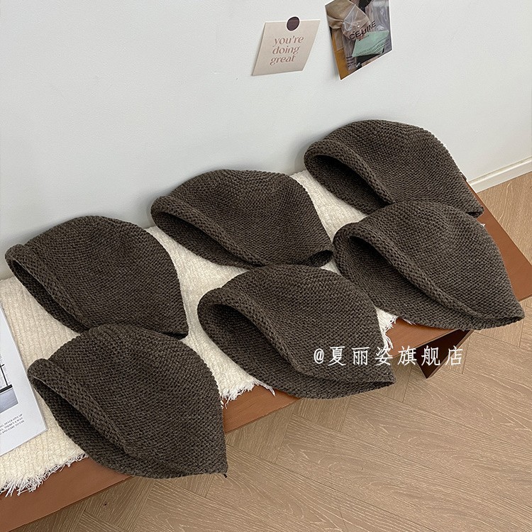 出口韩国含羊毛针织卷边水桶帽子女秋冬复古咖色渔夫帽大头围盆帽