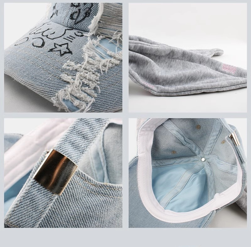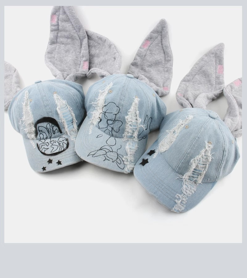 韓国と同じスタイルのウサギ耳付きひさし帽、デニムウォッシュ加工、落書き、香港スタイル、ダンス、野球、ヒップホップ帽子