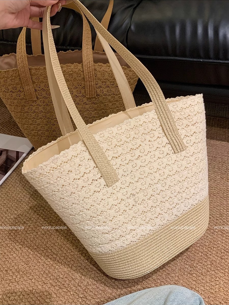 2024 夏レトロコントラストカラーステッチわらバッグ大容量手織りバッグシンプルなファッションショルダーハンドバッグ