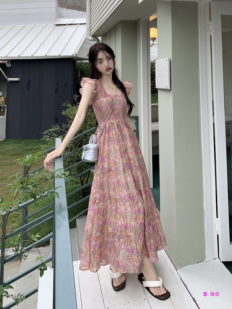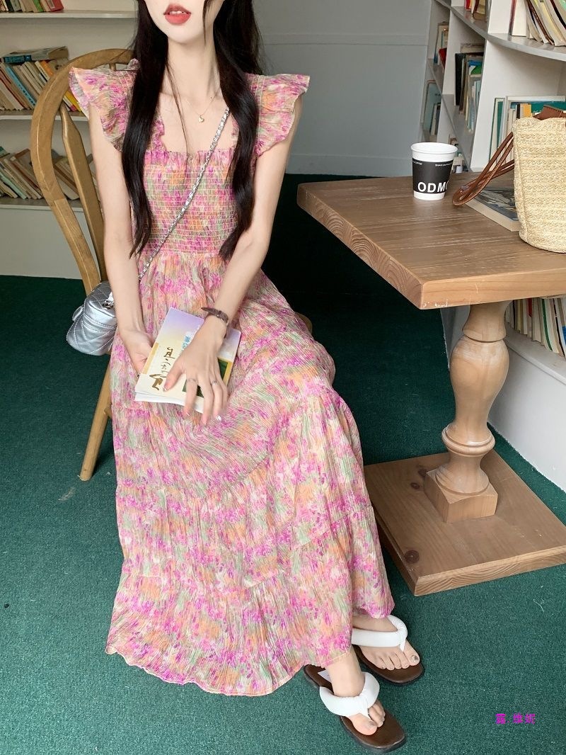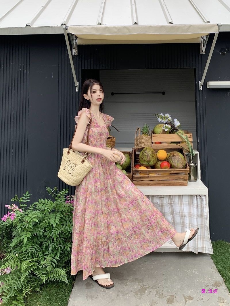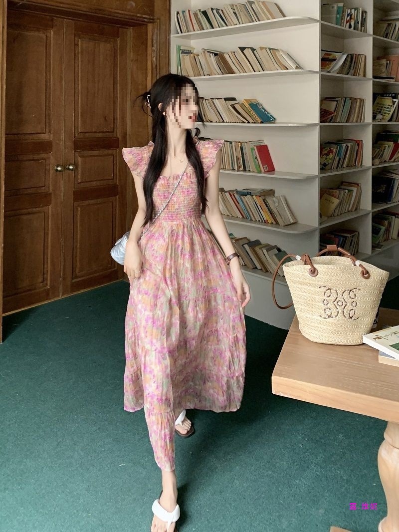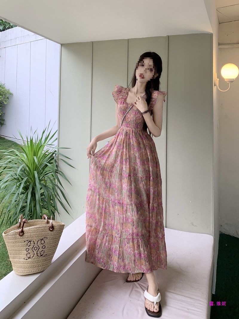 フライングスリーブ花柄ドレスデザイン夏の新しい妖精スカートファッショナブルでシックなスリムフィットロングスカートトレンディ