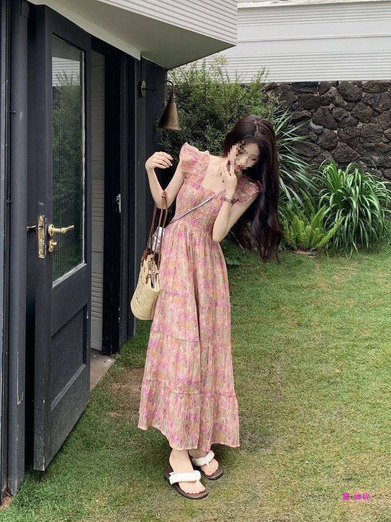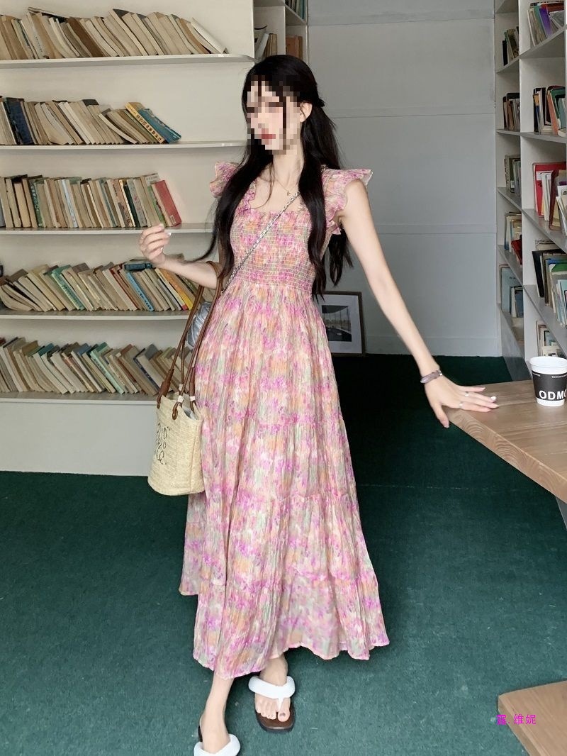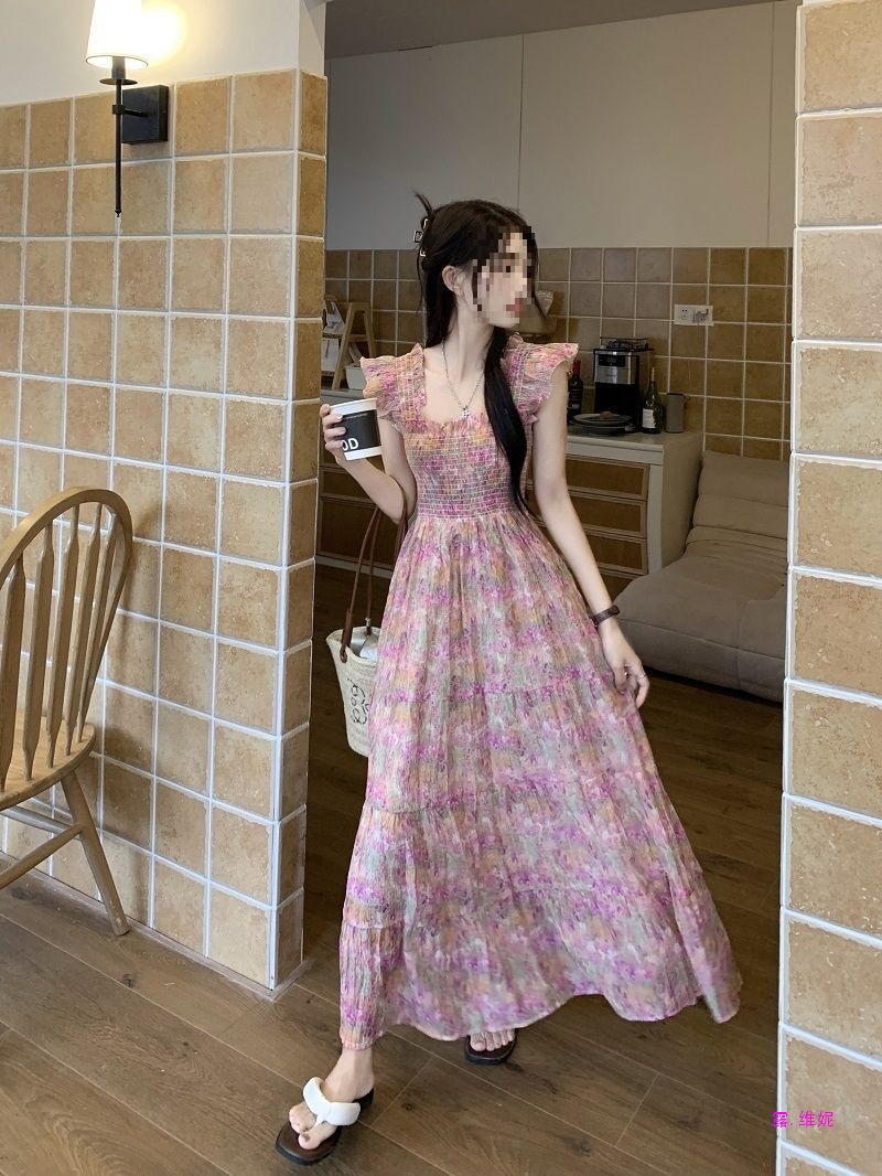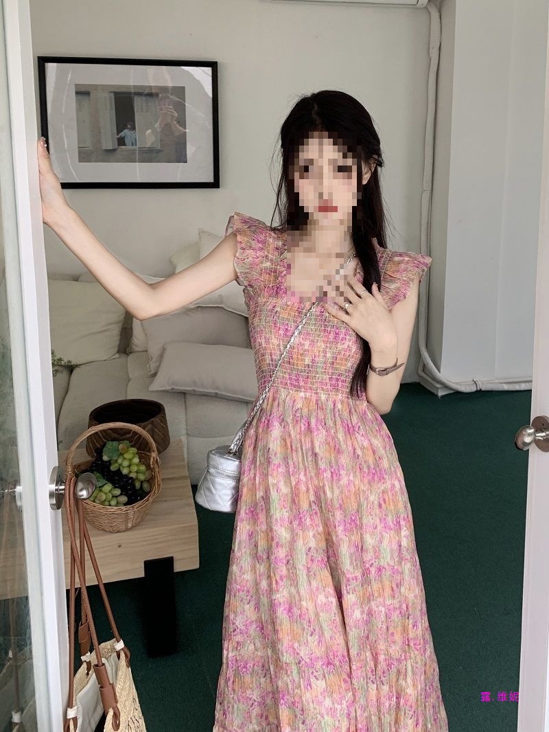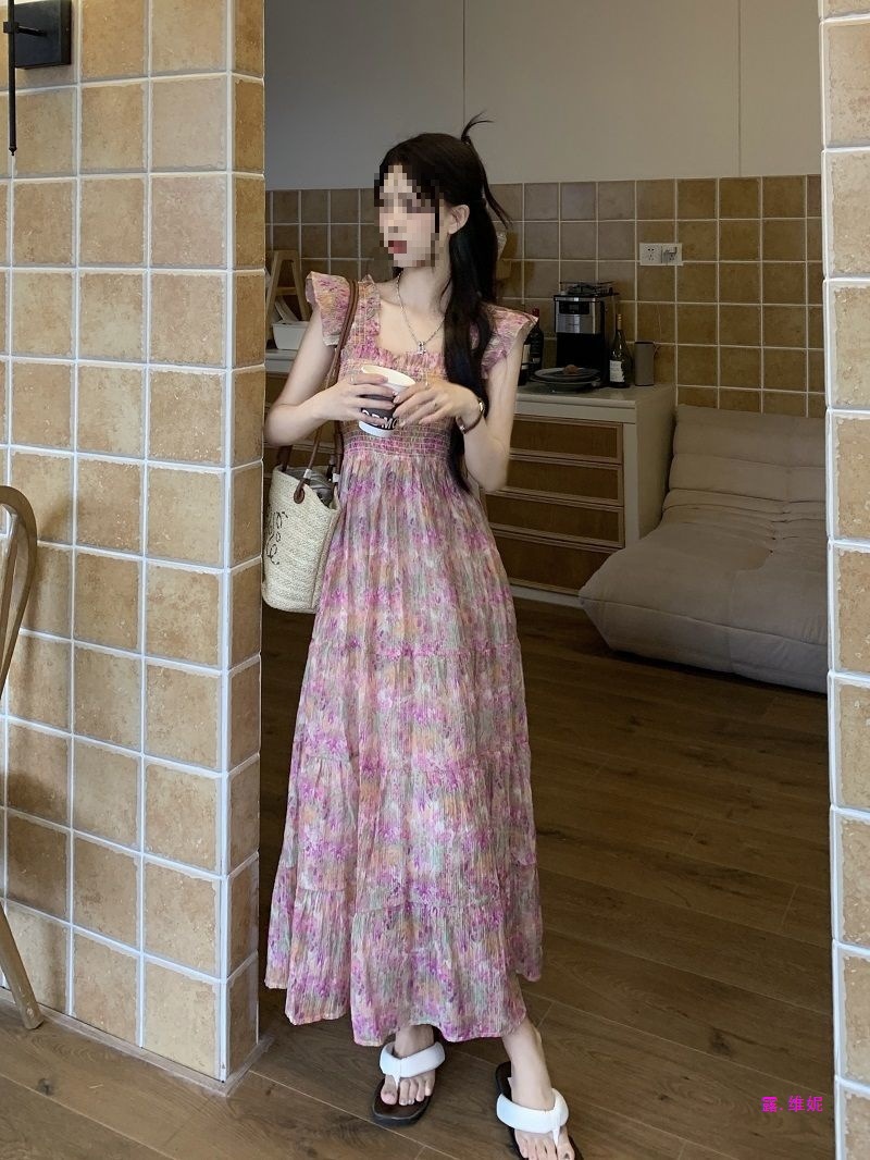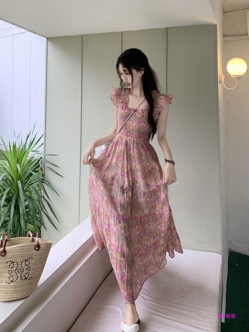 フライングスリーブ花柄ドレスデザイン夏の新しい妖精スカートファッショナブルでシックなスリムフィットロングスカートトレンディ