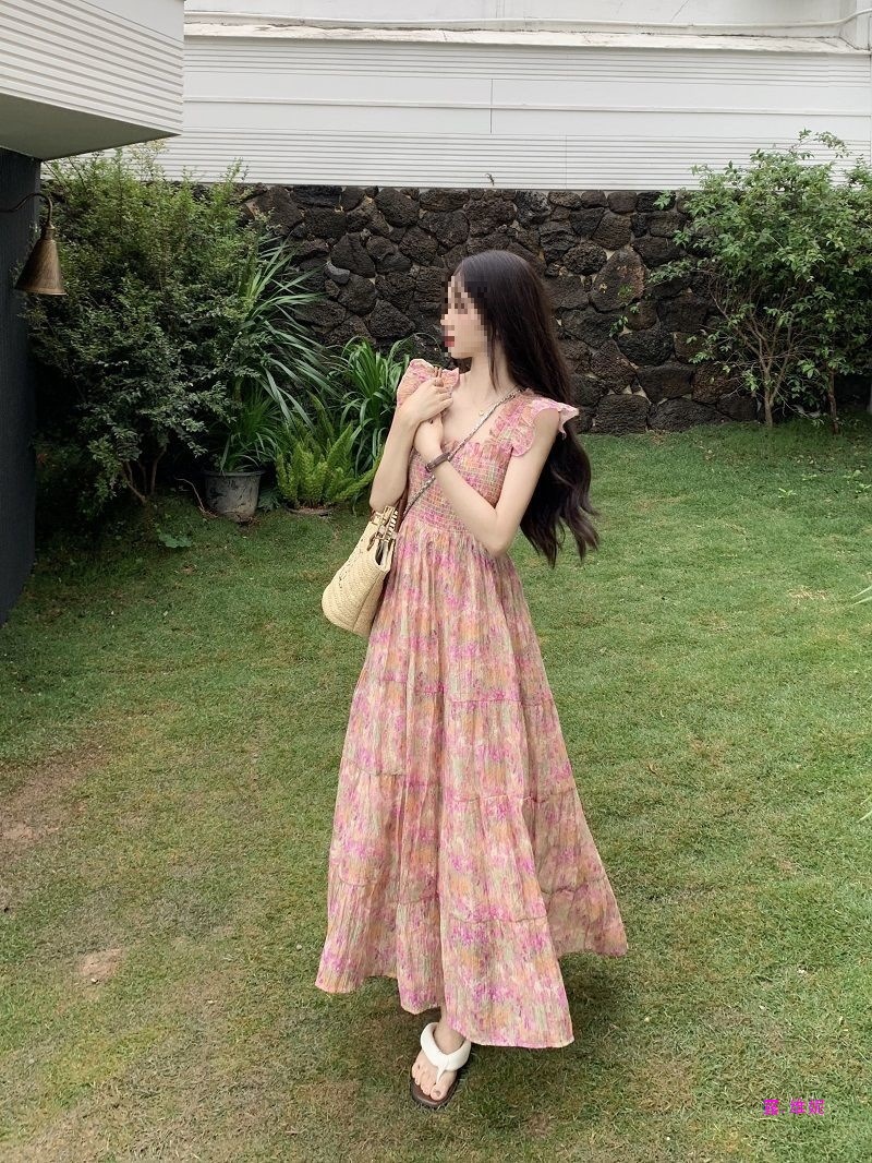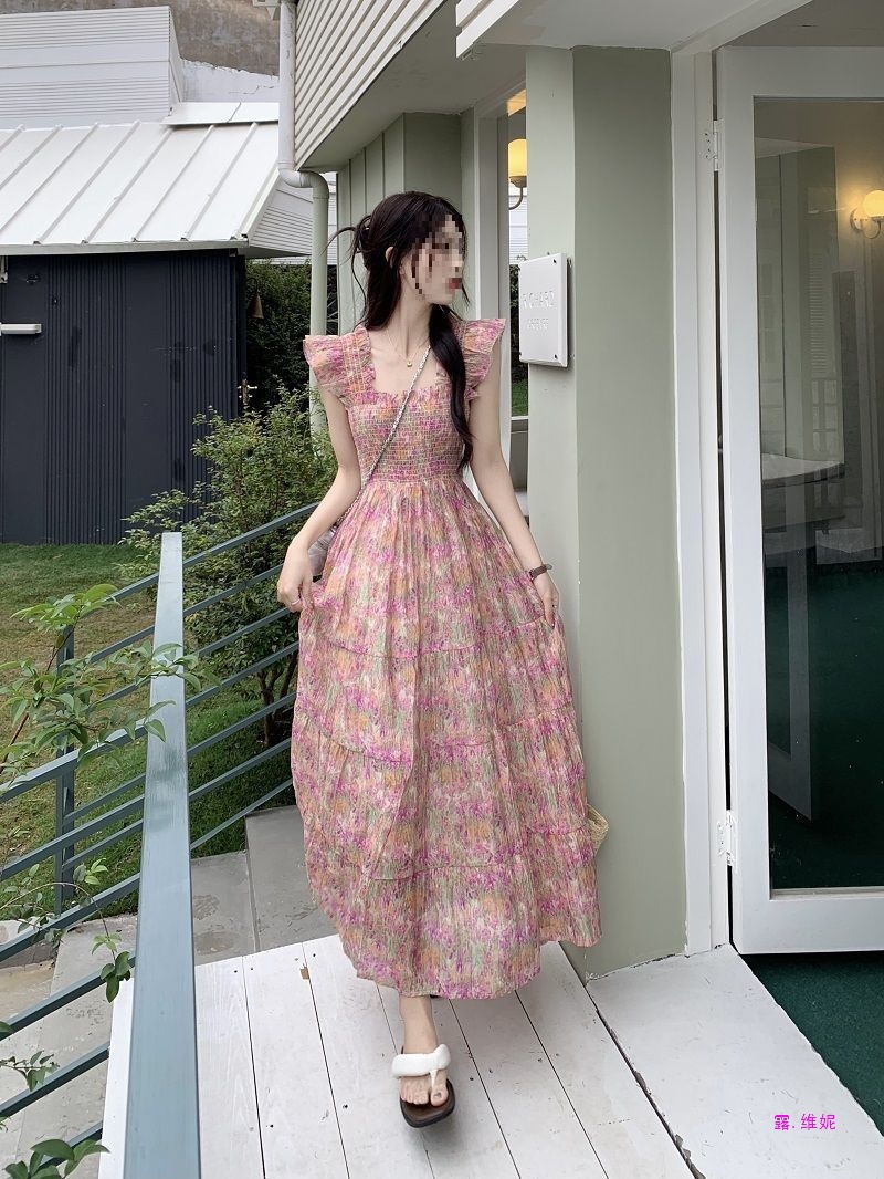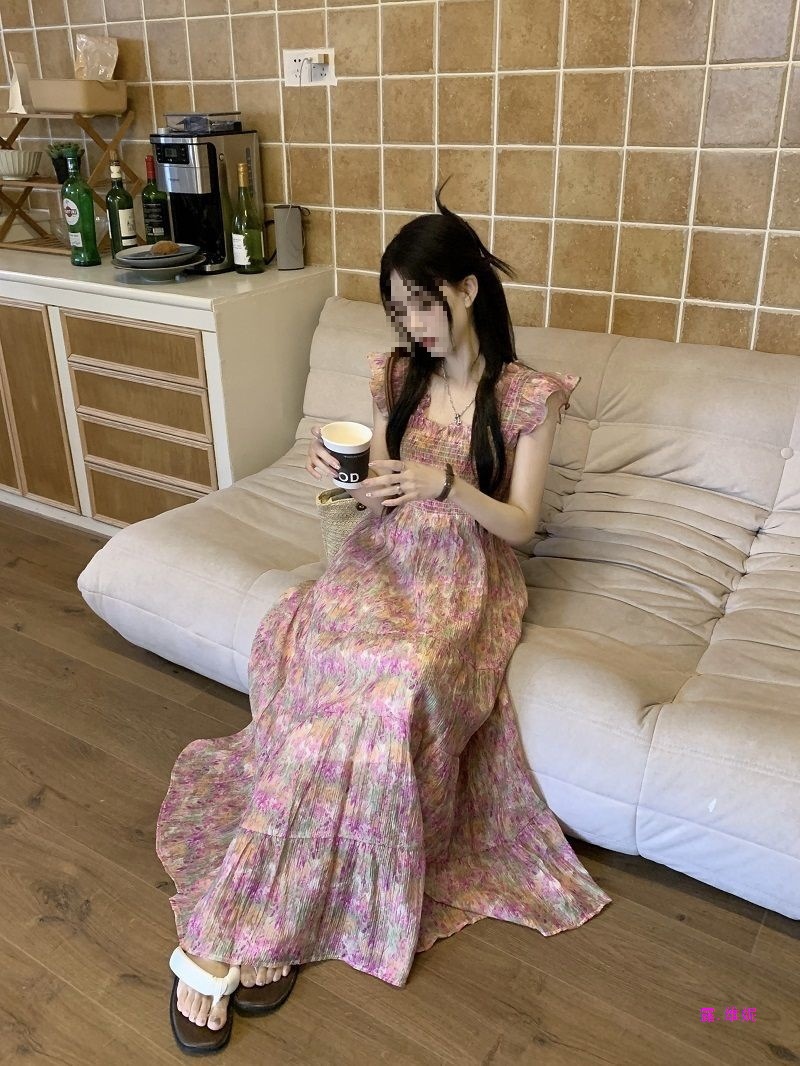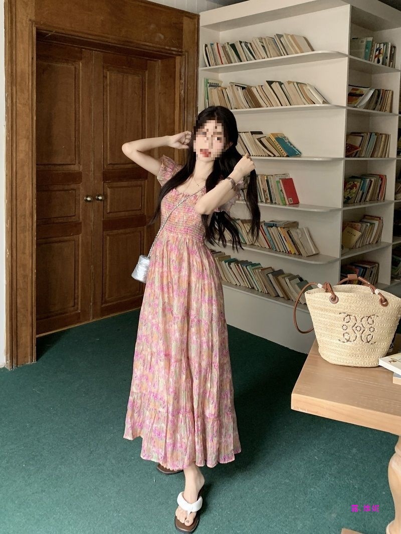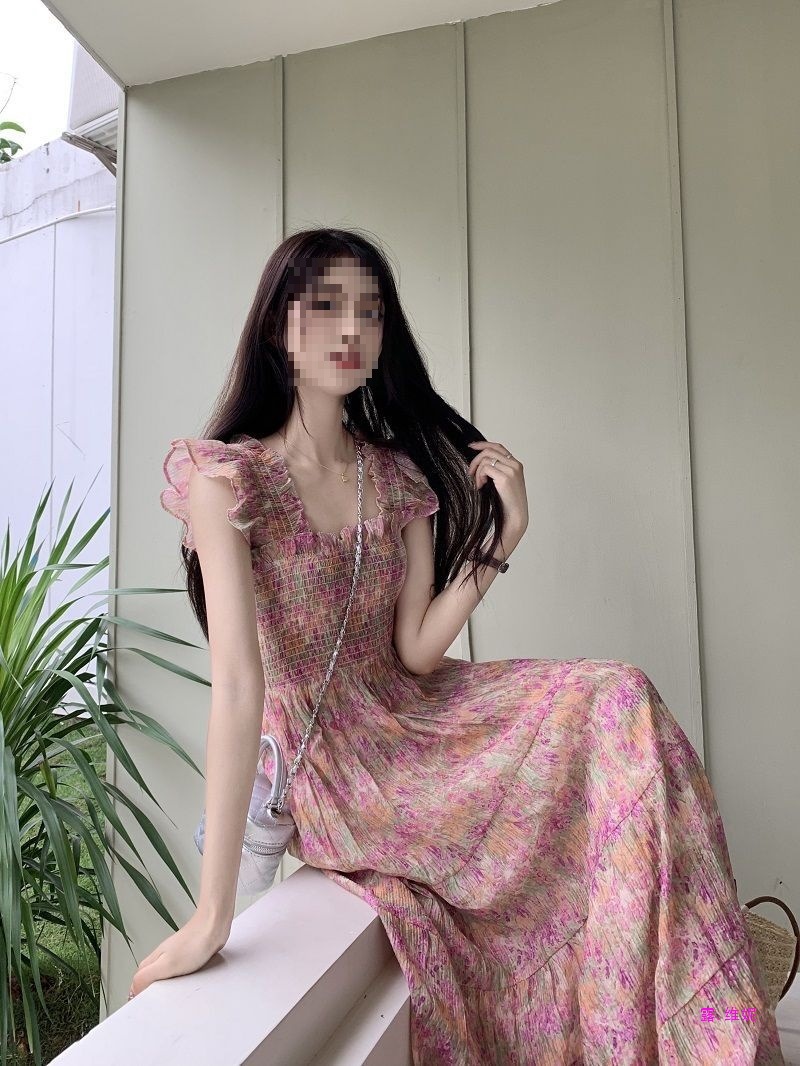 フライングスリーブ花柄ドレスデザイン夏の新しい妖精スカートファッショナブルでシックなスリムフィットロングスカートトレンディ