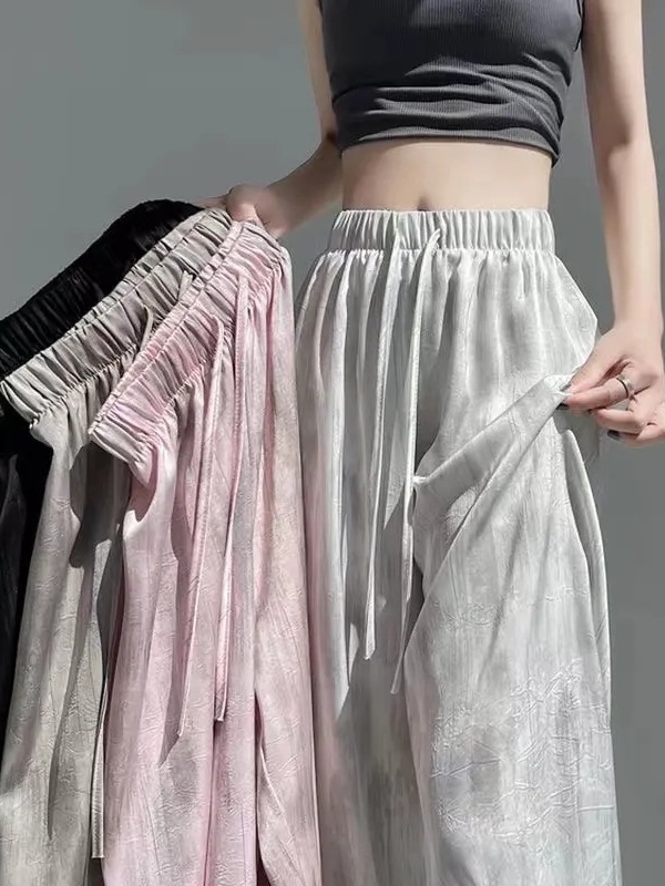 夏の薄いタイプの氷糸のサテンの水墨画は広くて足のズボンの女性を染めます。