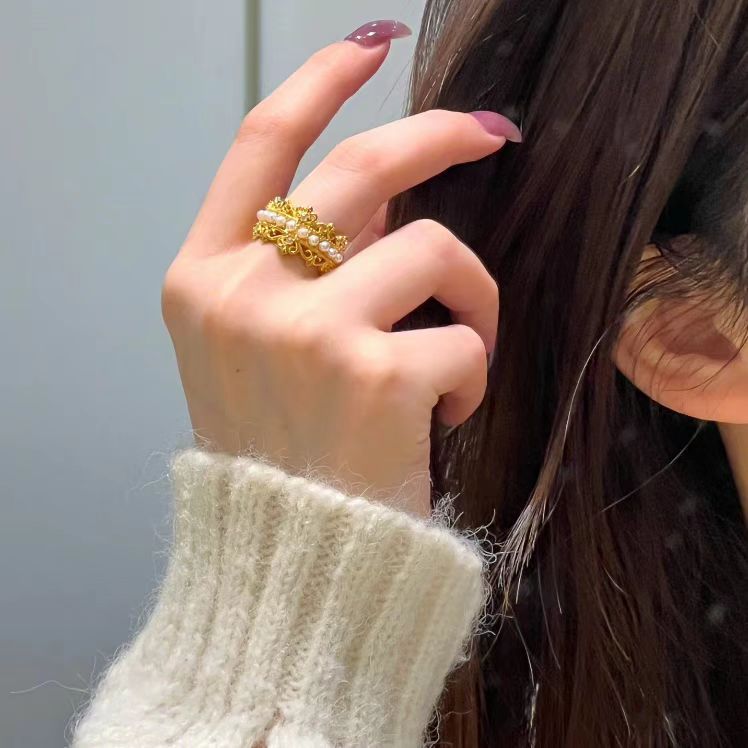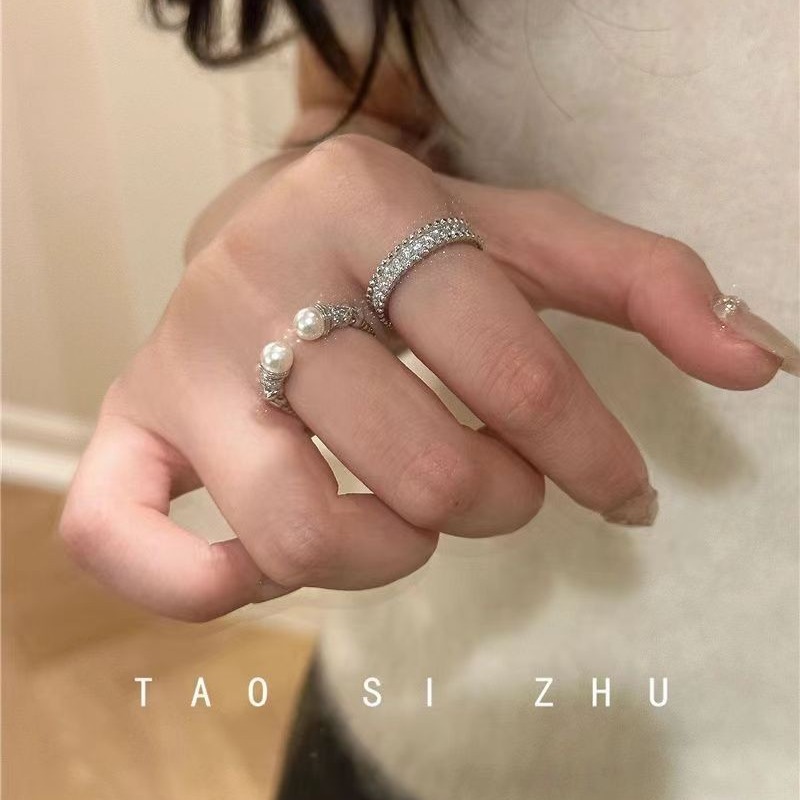 高級感気質麻花真珠開口指輪秋冬軽贅沢ファッション全ドリルワイドリング