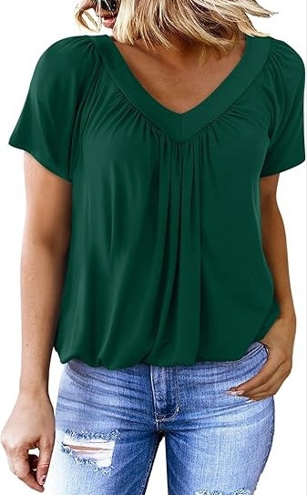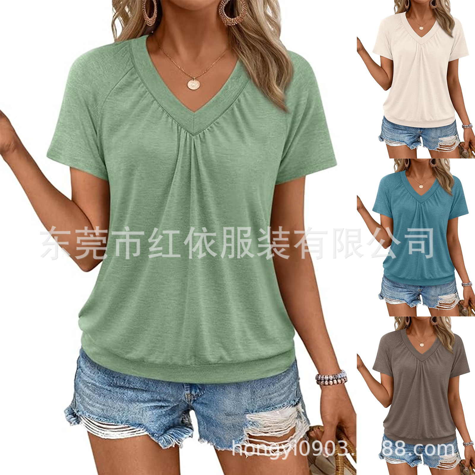 女式T恤春夏季亚马逊欧美女装新款V领褶皱沙滩度假时尚短袖上衣女