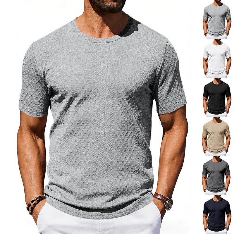跨境亚马逊Tiktok夏季新款男士提花纹理T恤休闲宽松纯色圆领短袖
