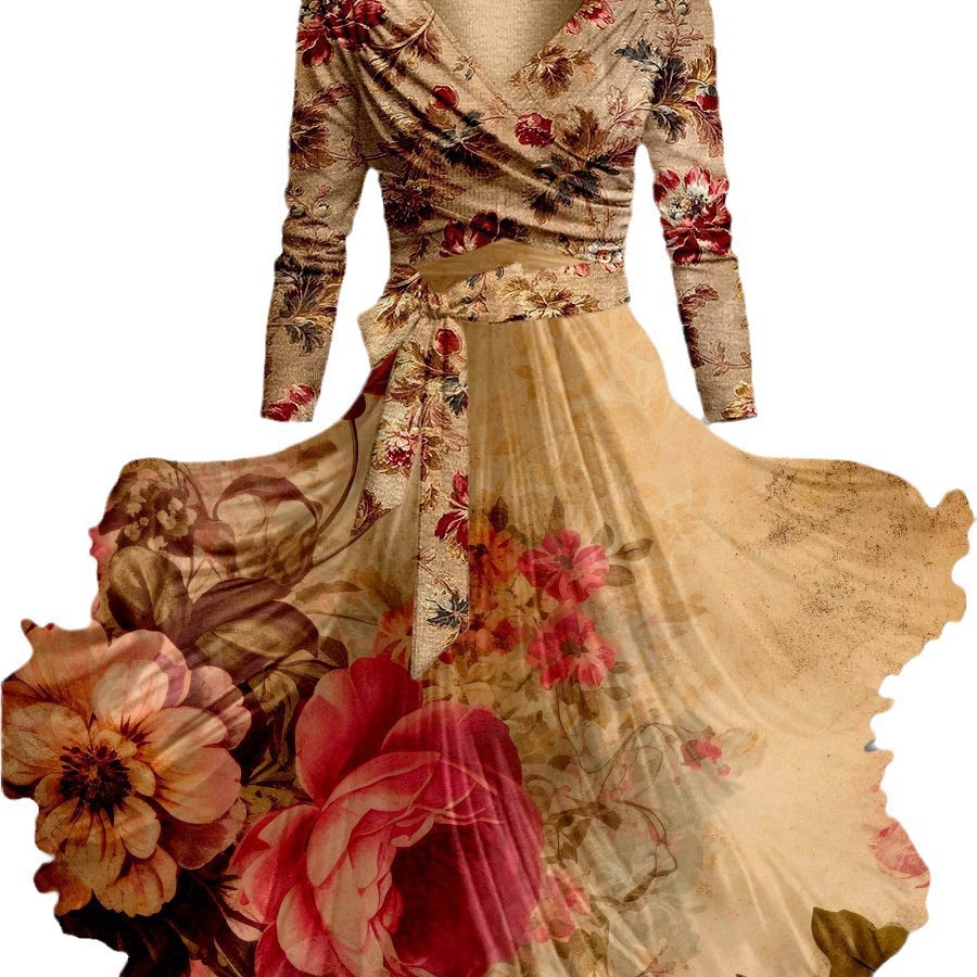 2025 新しいクロスボーダー 3D 植物と花のプリントシェーディング夏 V ネックエレガントなミッドレングスの女性のためのドレス