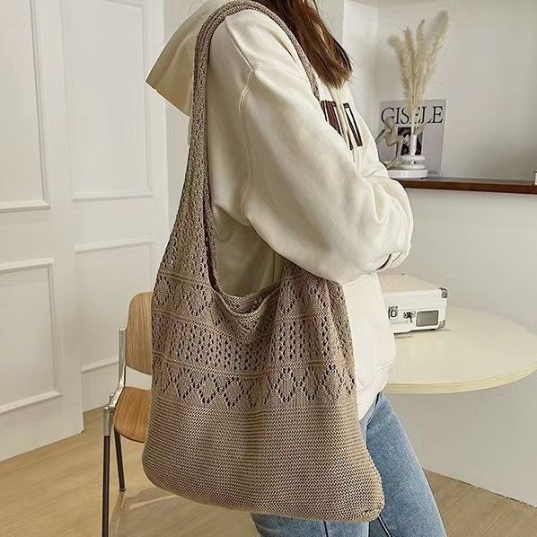 2022新型韓国insニットバッグ純色透かし彫りショルダーバッグ大容量トートバッグ女性潮