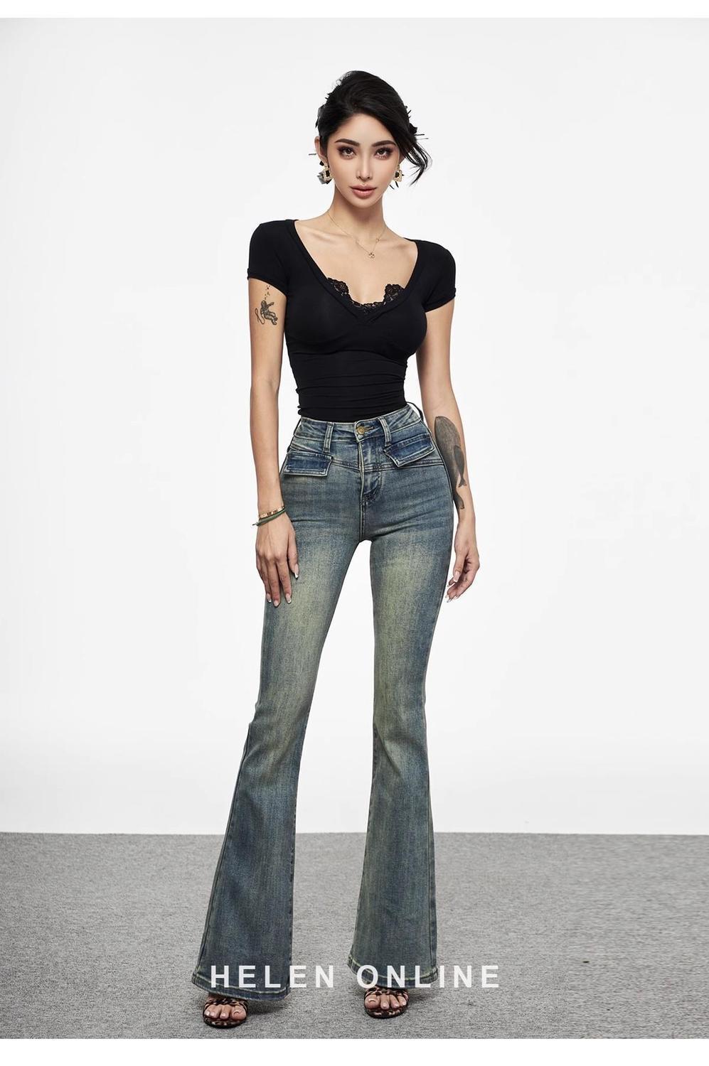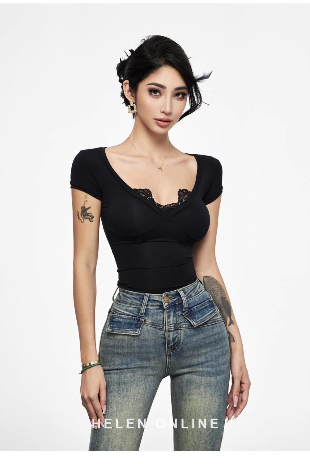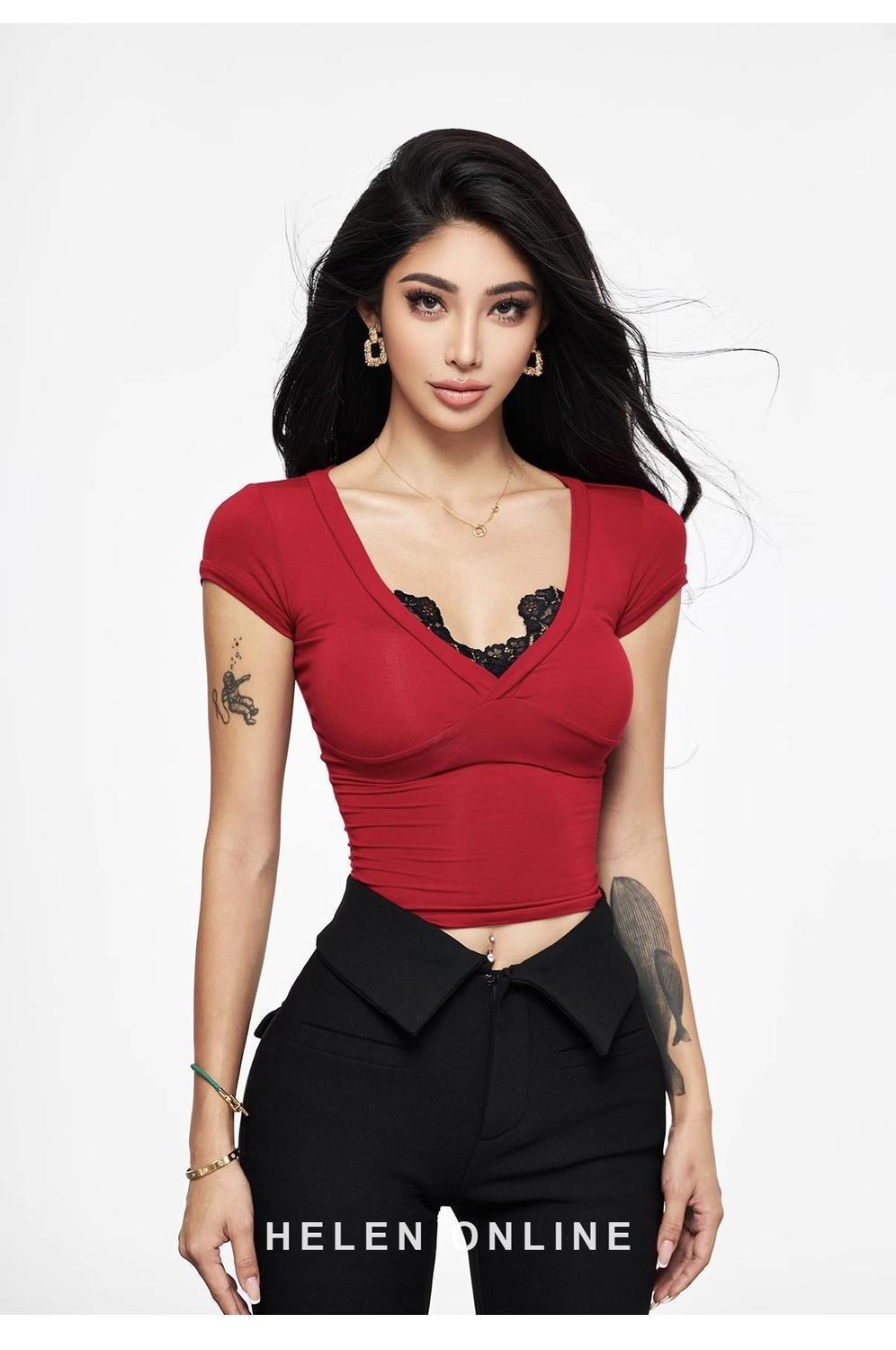 アメリカンセクシーなスプライスレースVネック半袖Tシャツ、女性用夏のホットガールスタイルのタイトでスリムなショートトップ
