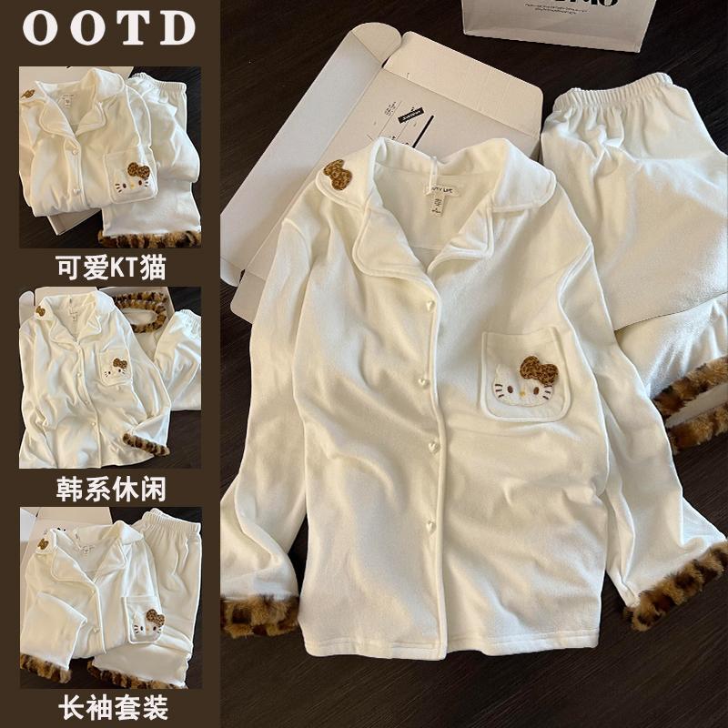 德绒长袖睡衣女秋冬季毛绒豹纹甜美风可爱kitty猫保暖家居服套装