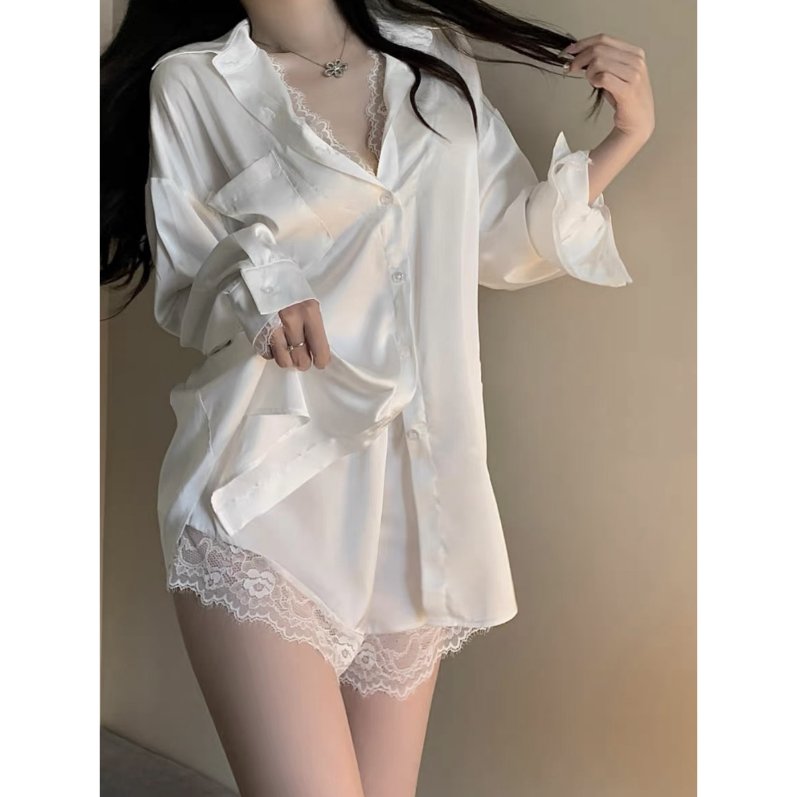酔っ払い彼氏風シャツ氷糸セクシー大サイズパジャマ純欲女レースサテン偽二枚パジャマホームウェア