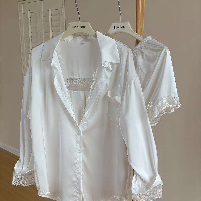 韓国系のシャツのレースの氷糸のパジャマの女性2025春夏の長袖の半ズボンの白い大きいサイズの部屋の服のスーツ
