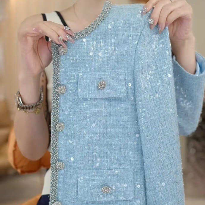 今年流行漂亮蓝色小香风外套春秋新款韩剧穿搭粗花呢气质名媛上衣