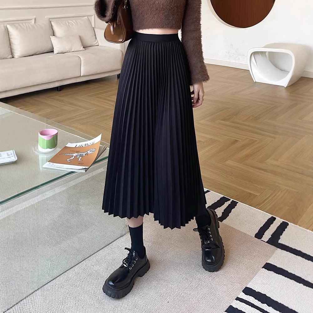 黒のスタイリッシュなプリーツスカートハイウエストストレートスカート女性のための 2025 新しい多用途痩身スカート在庫あり