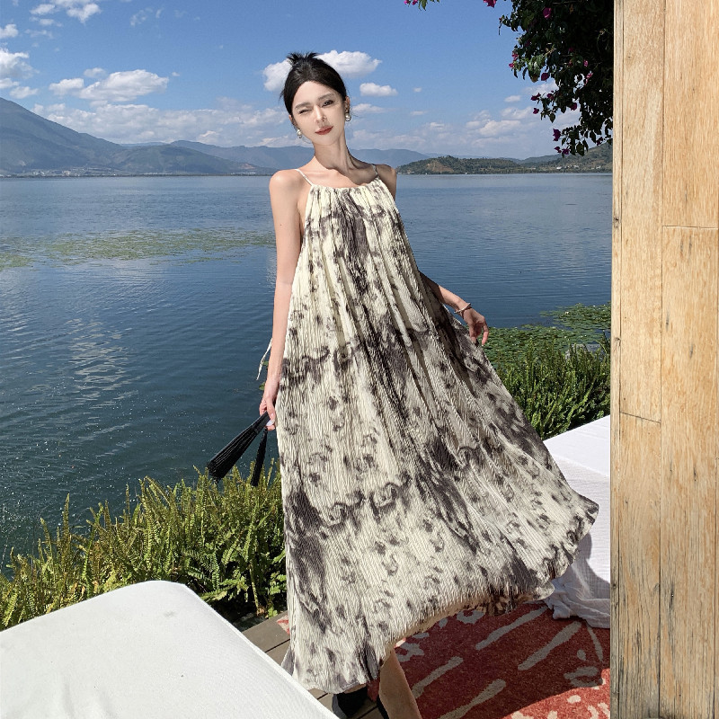 レトロな水墨画ブルーミングサスペンダードレス夏の新しい社交界の休暇スカートしわビーチドレスロングドレス