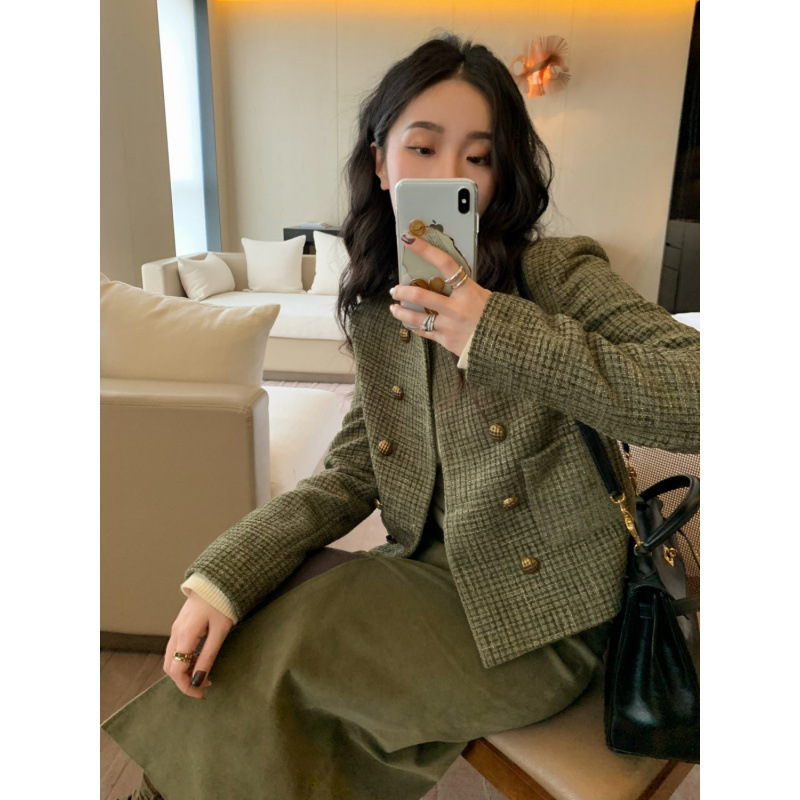 レトログリーンスモールフレグランスジャケットレディースツイードスモールジャケット新しいフレンチセレブショートスモールジャケット卸売