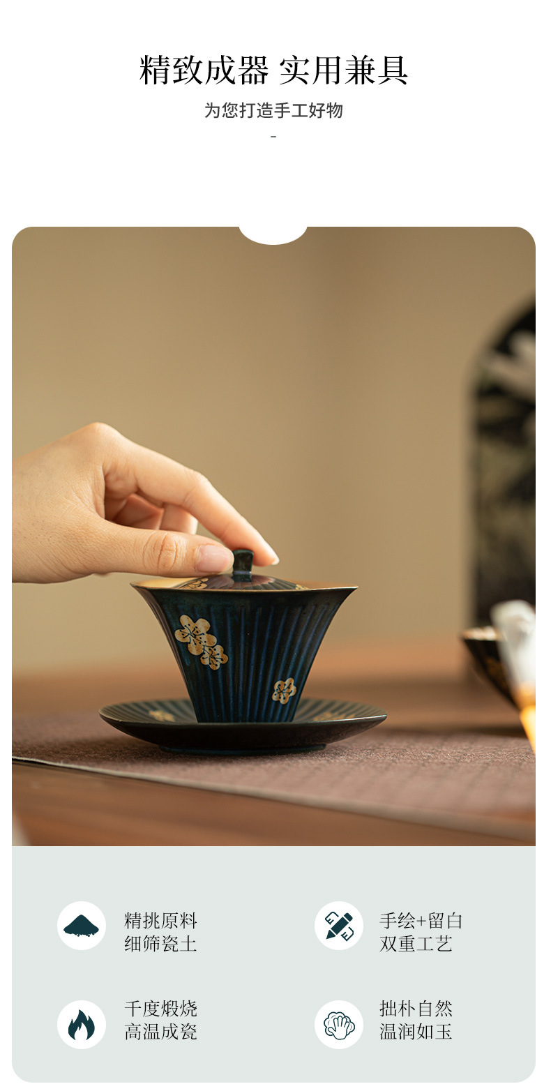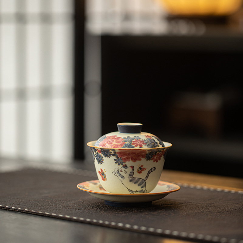 岩矿白手绘描金盖碗三才盖碗繁花猫系列精致泡茶碗陶瓷茶具功夫茶