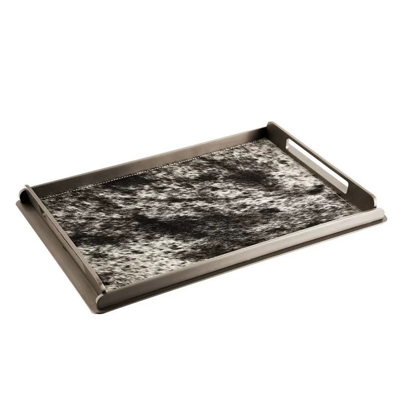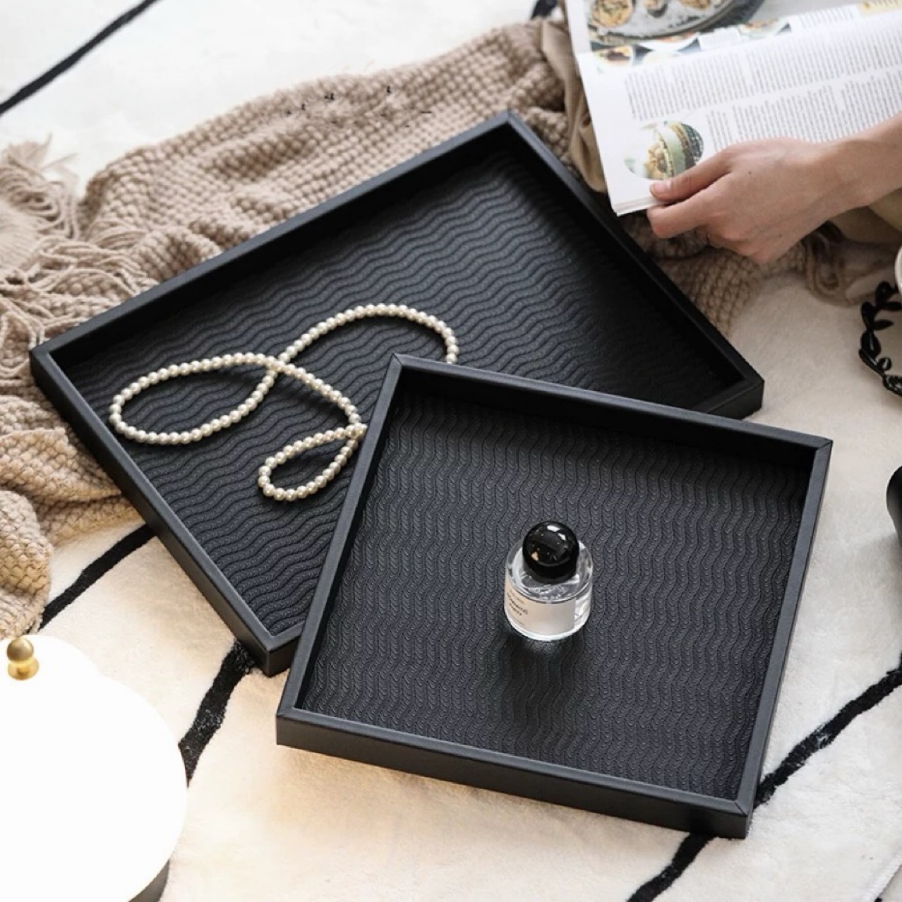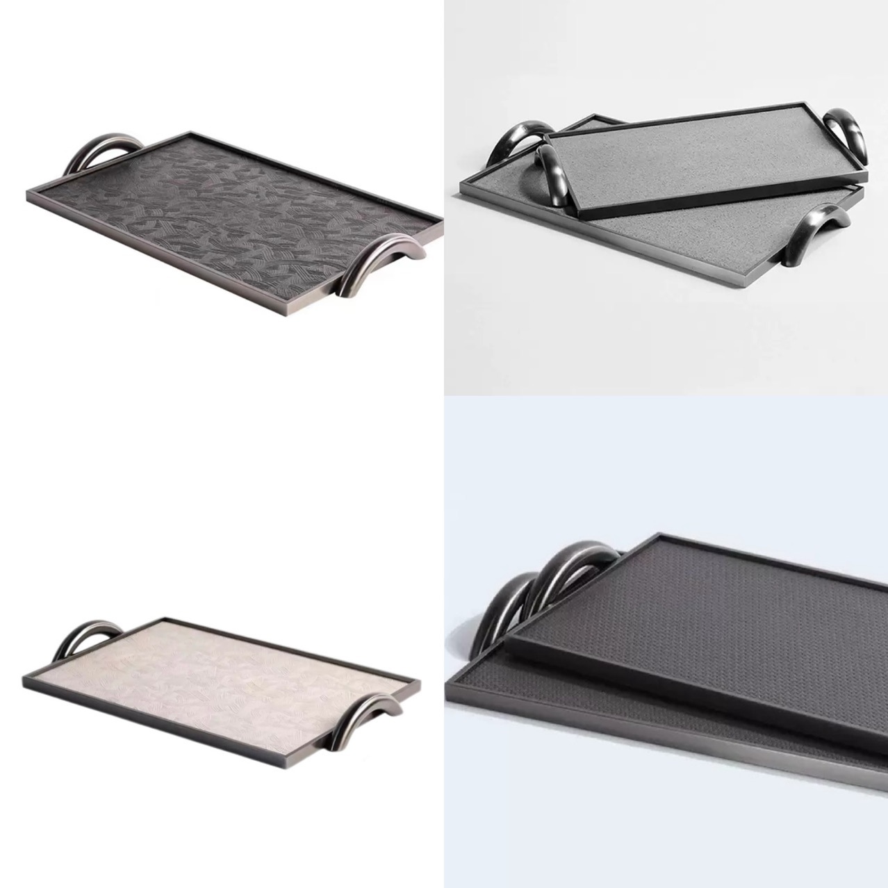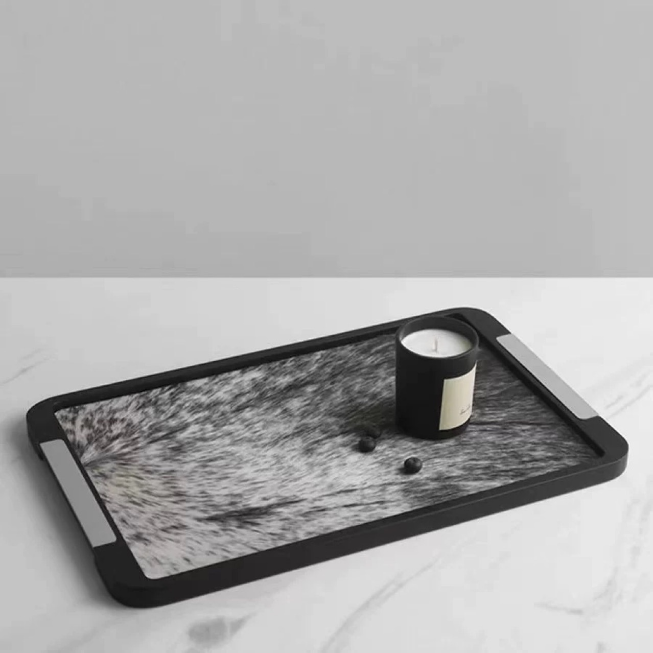 軽奢収納トレイ ガンブラックシルバーメタル馬毛トレイ クローゼット寝室メタル手作りトレイ