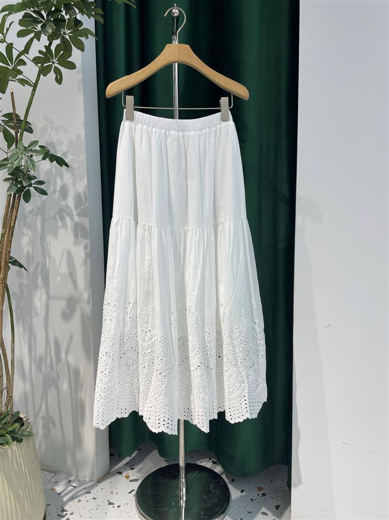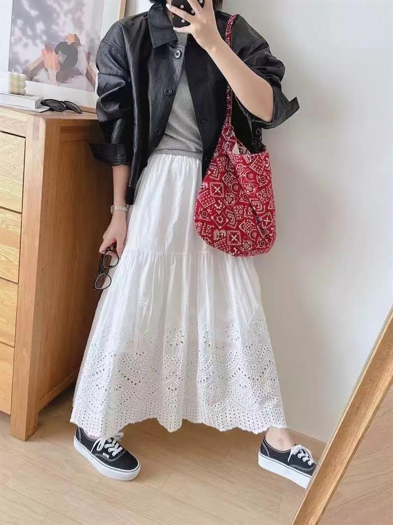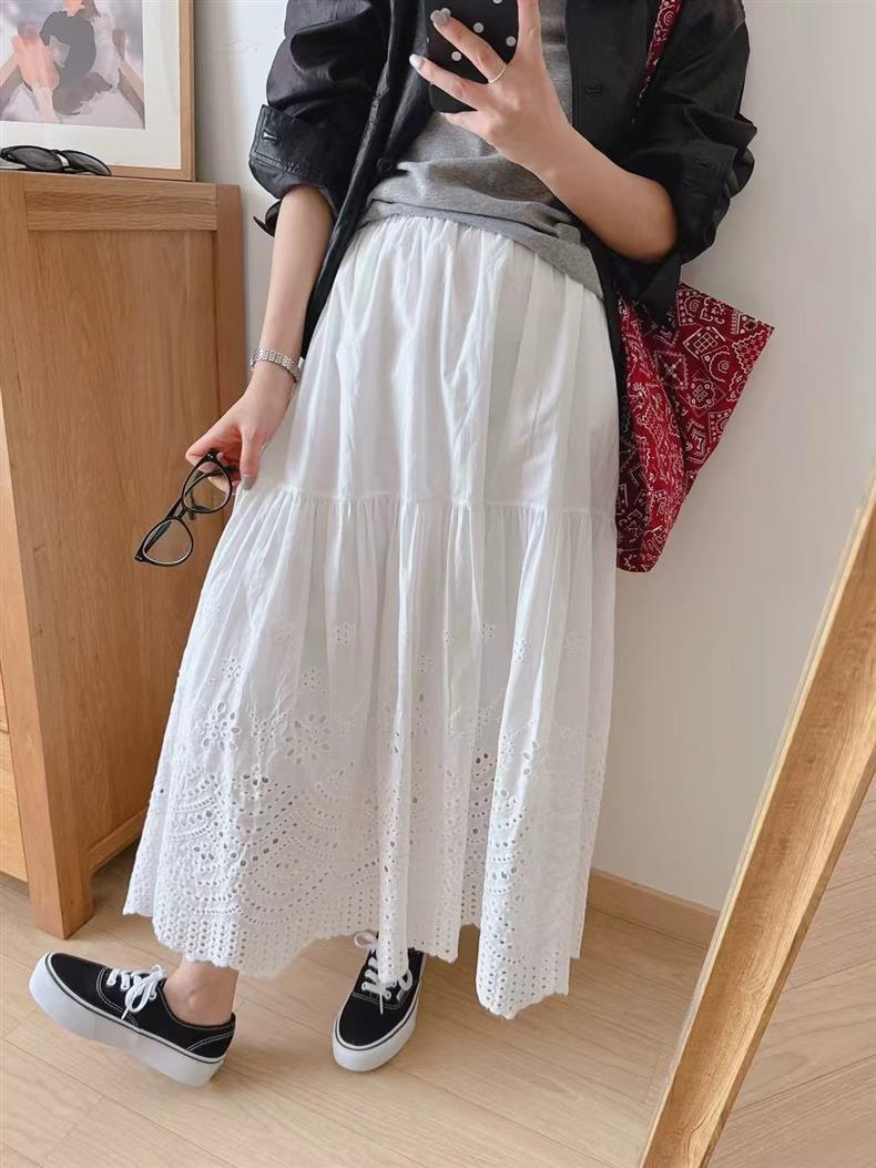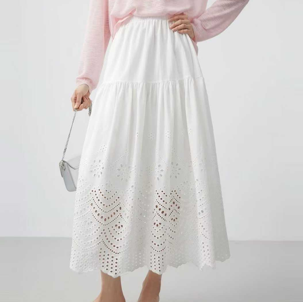 2025春夏花边蕾丝镂空纯色柔软棉质大摆半身裙女长裙