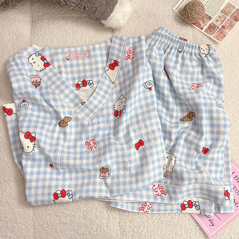 雲の綿のパジャマの女性の夏の薄いタイプの高級感の半袖のスーツの格子の家の服の夏は外で越境の卸売りを着ることができます。