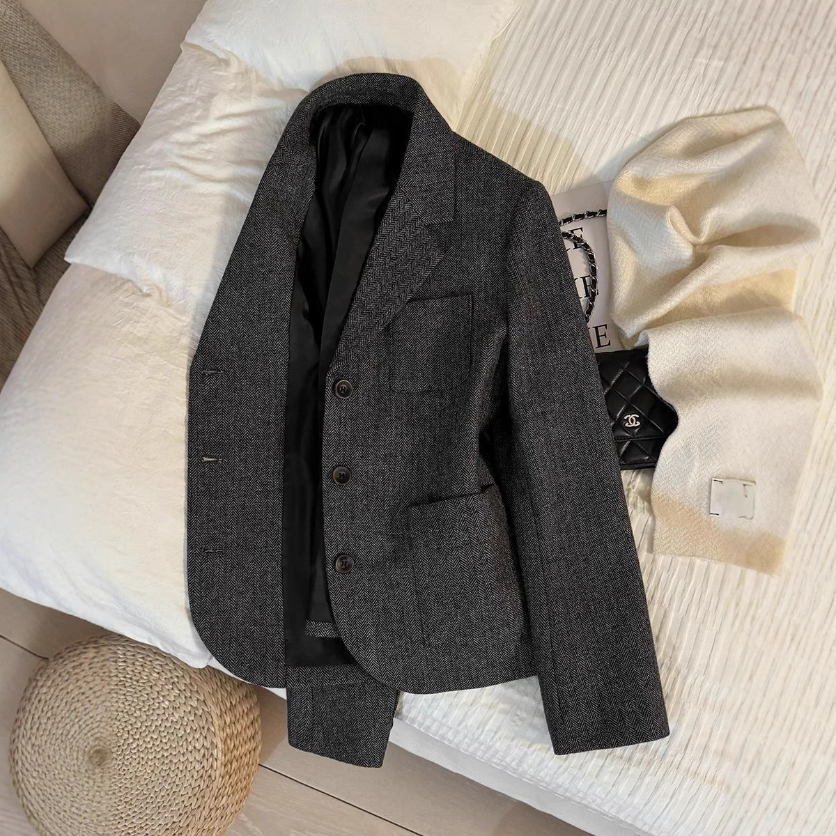 灰色毛呢人字纹短款西装外套女2025冬季新款时尚通勤正装西服9529