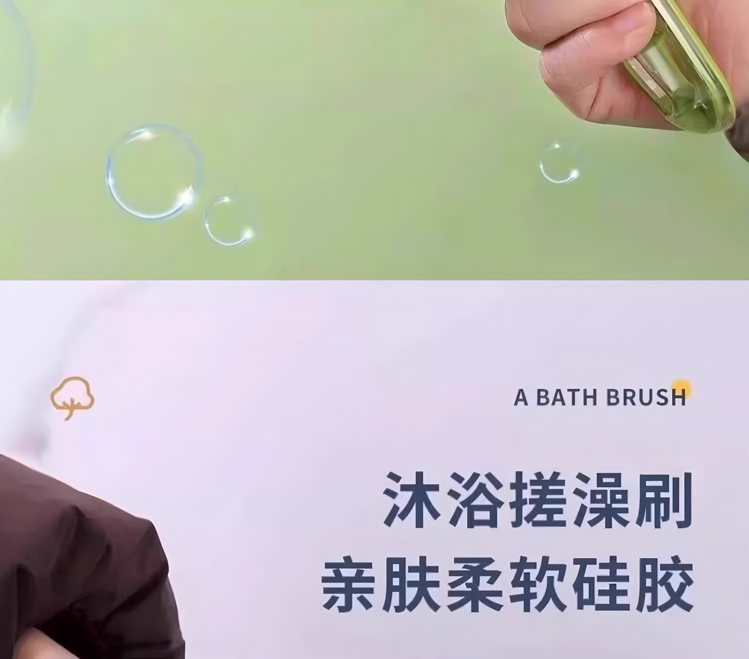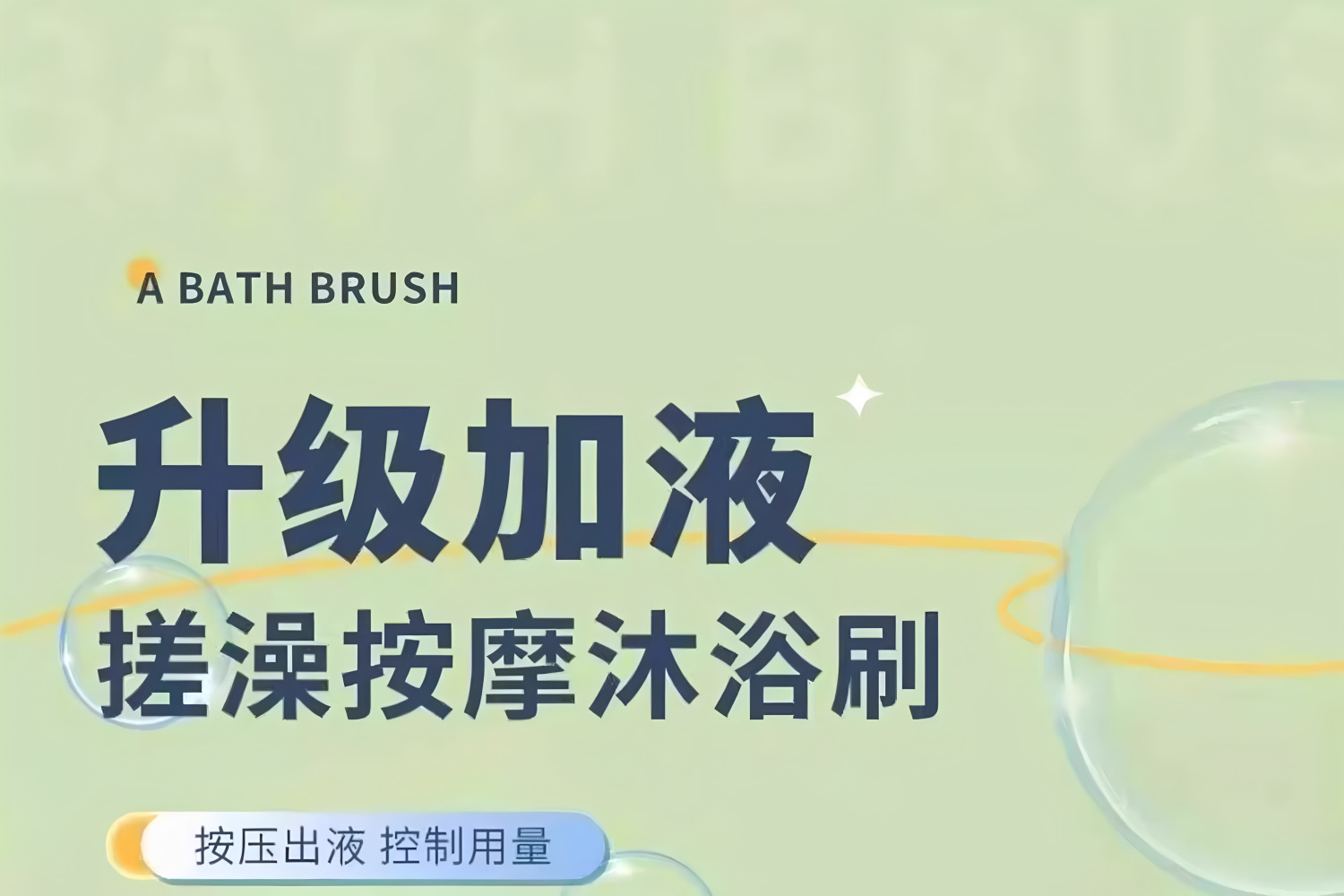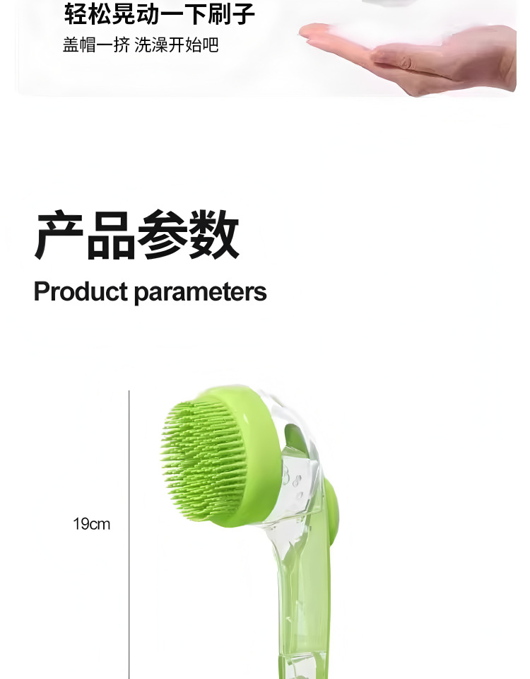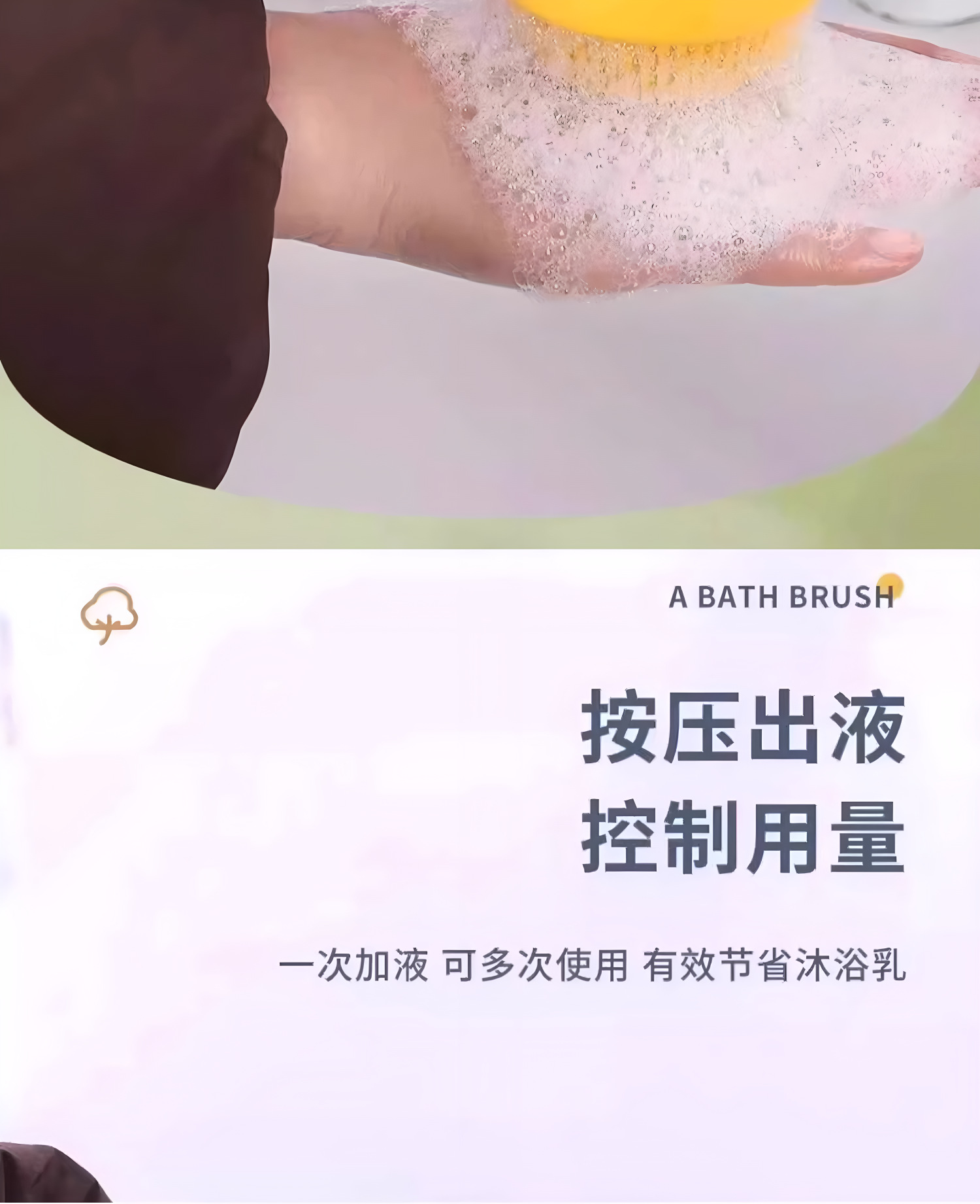 新型の長い柄の風呂ブラシは押し出し液を押して背中をこすります。