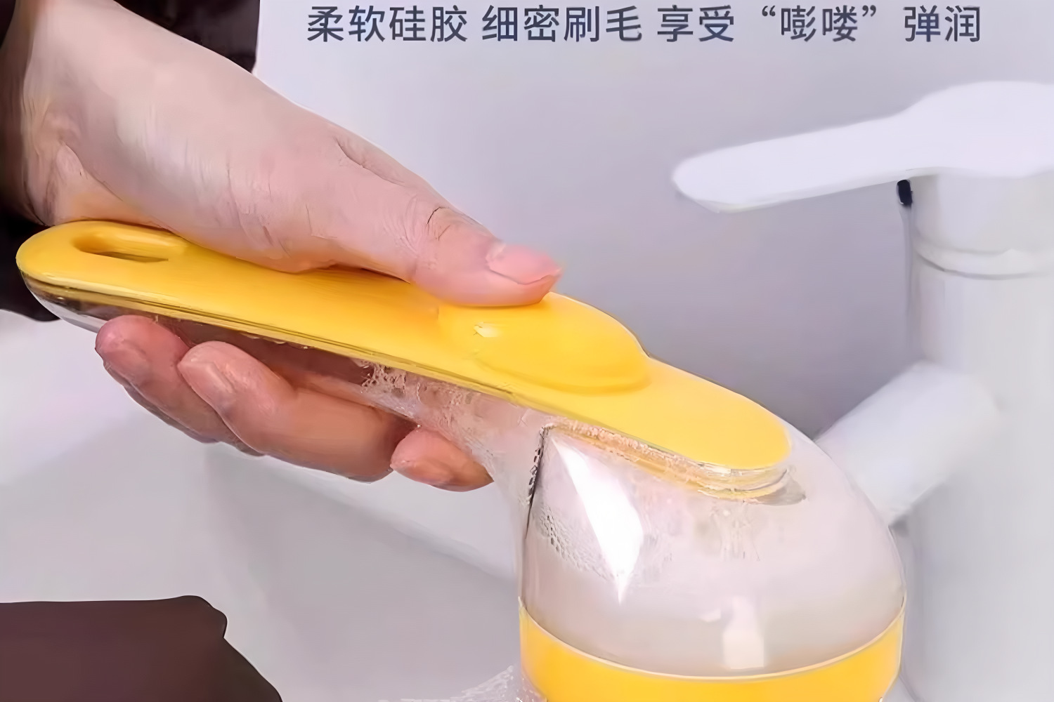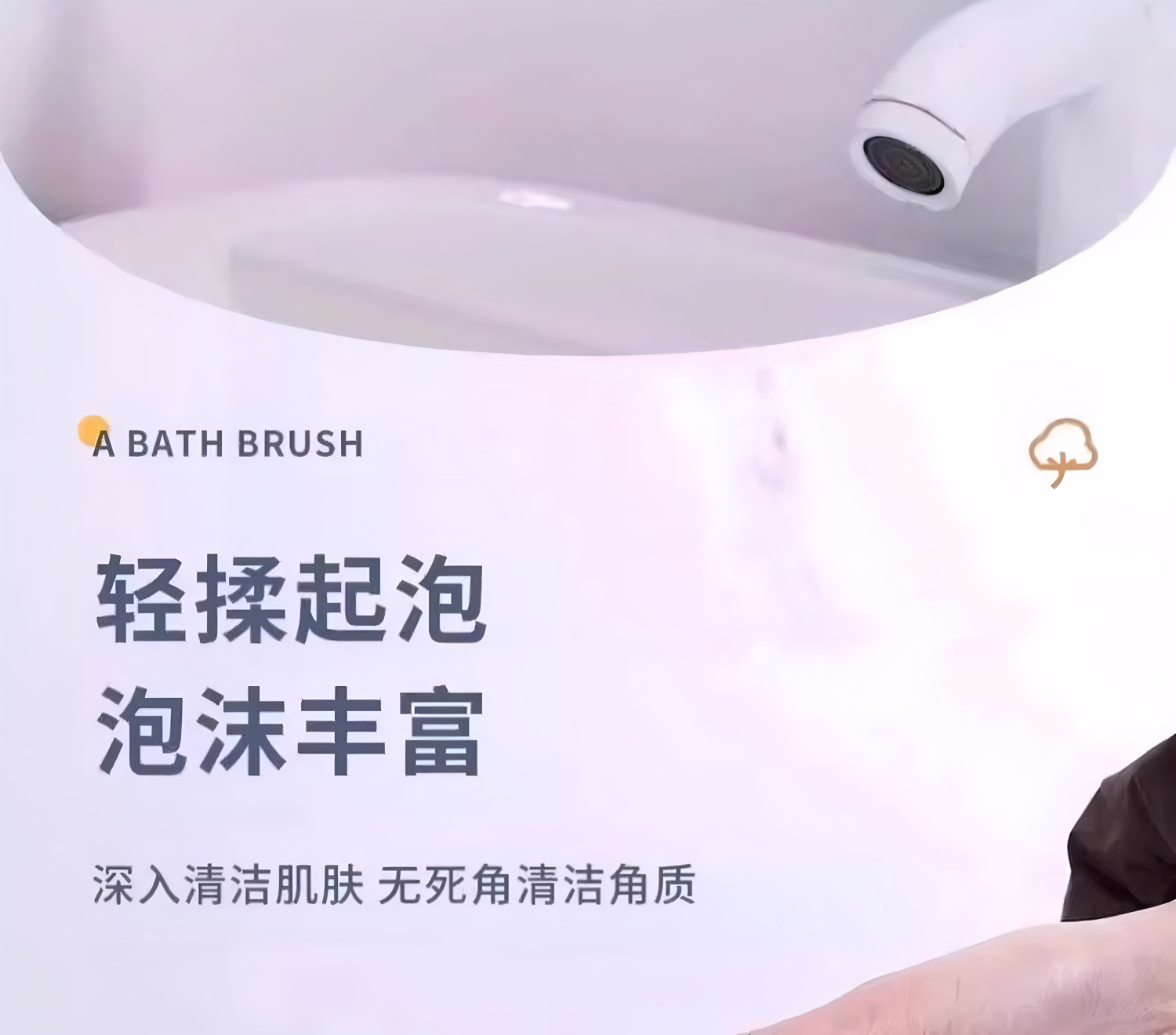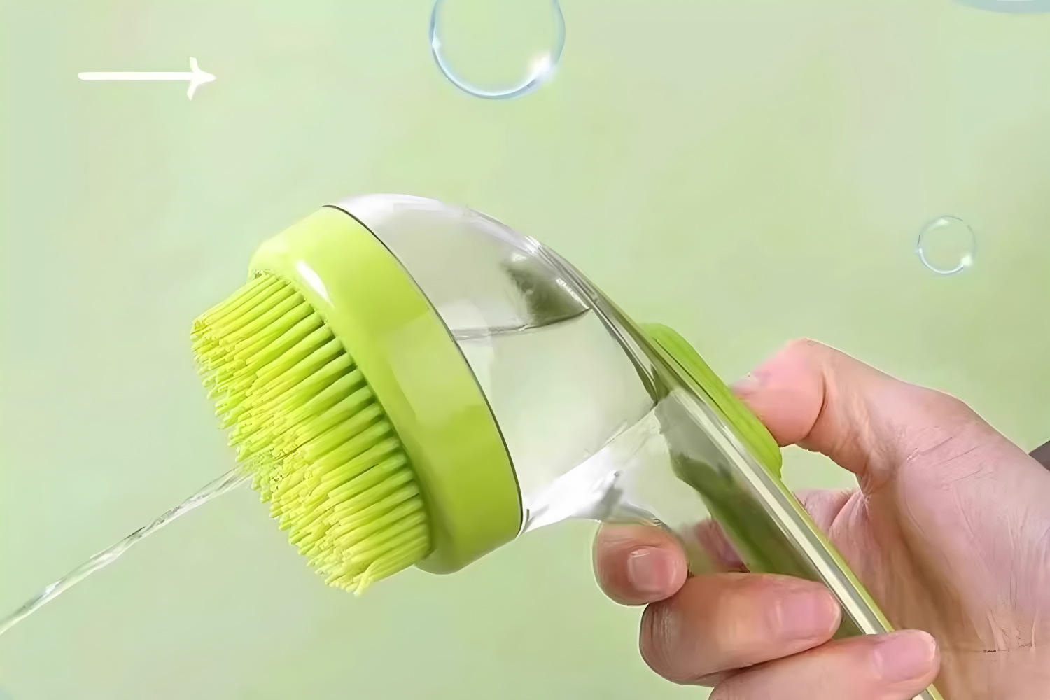新型の長い柄の風呂ブラシは押し出し液を押して背中をこすります。