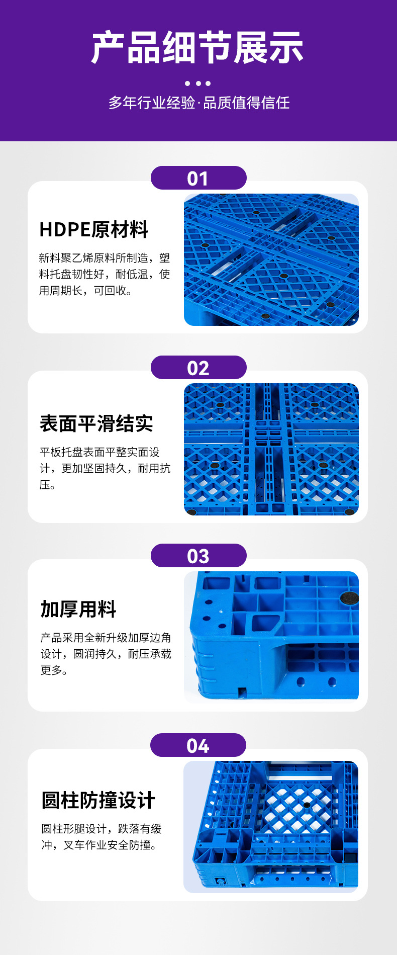 メーカーはプラスチックパレット、床タイル用パレット、新素材、リサイクル素材、厚みのある耐荷重性の良い床タイル用パレットを供給しています。