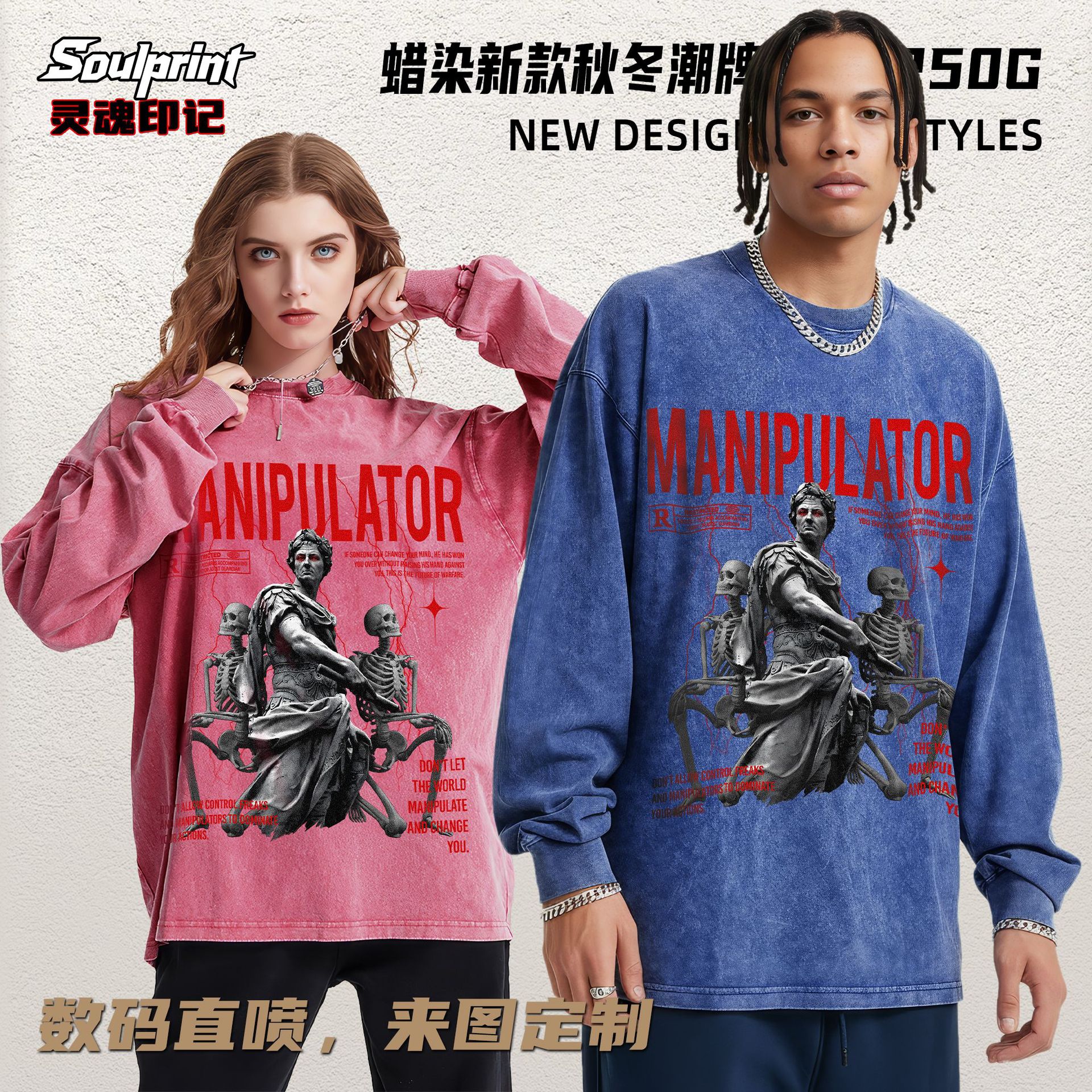 跨境新款圆领t恤长袖美式街头数码直喷印花来图印花宽松男女t恤