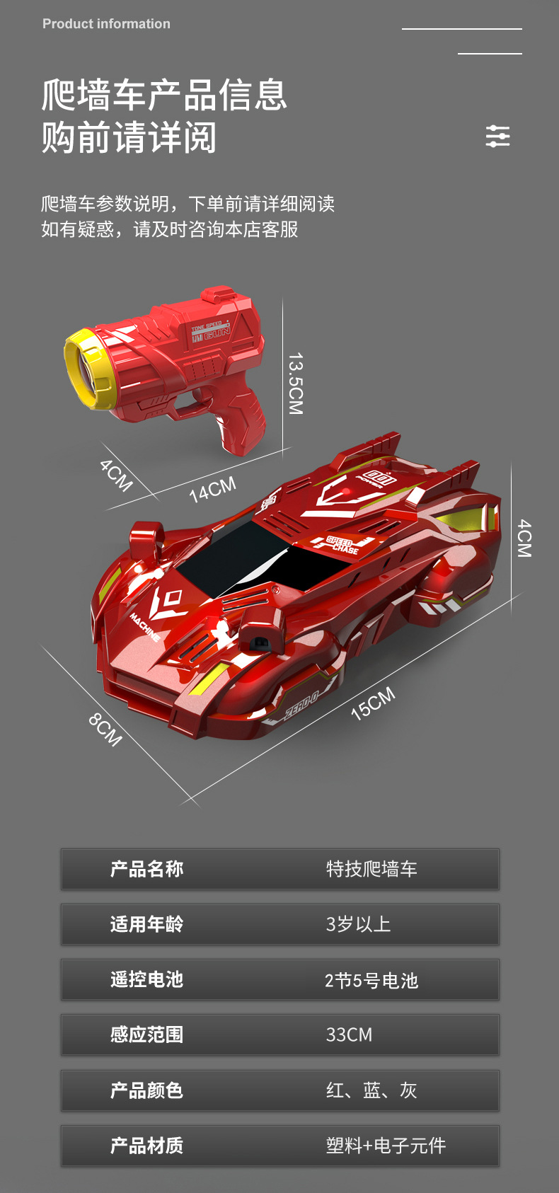 颜色 蓝色追光爬墙车,红色追光爬墙车,灰绿色追光爬墙车