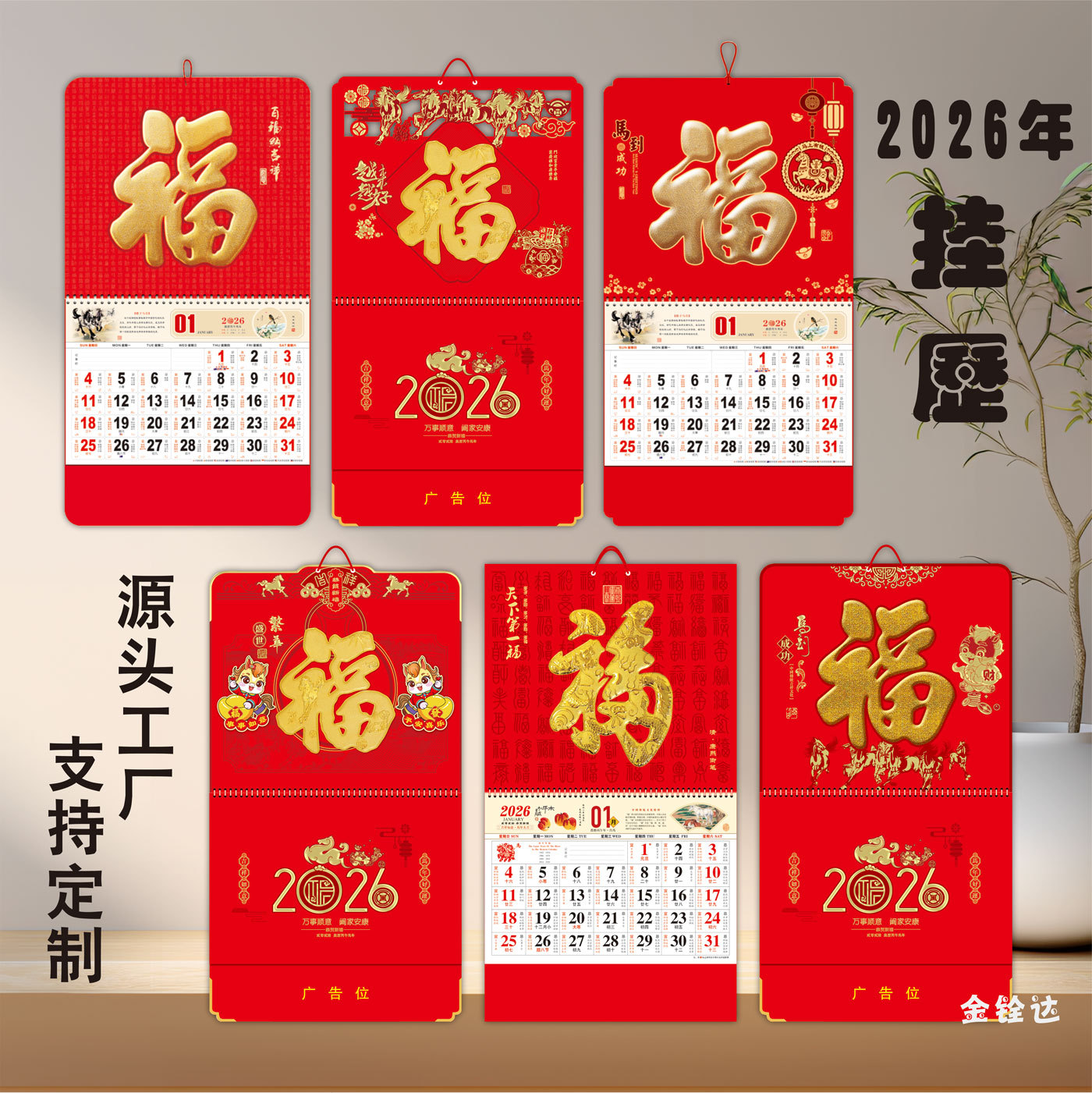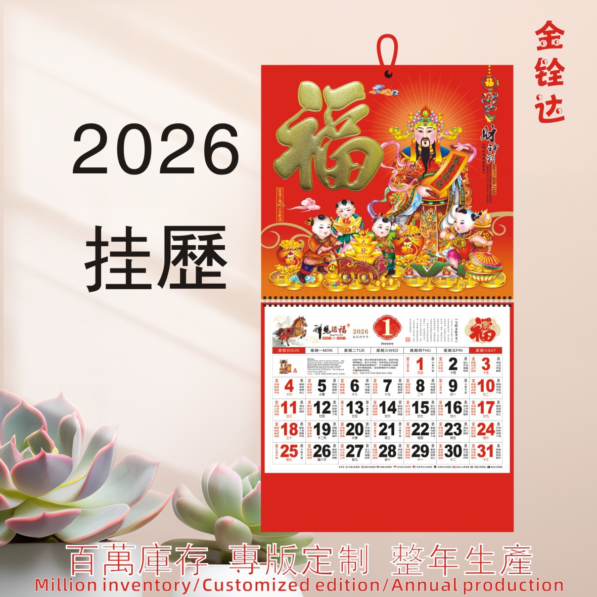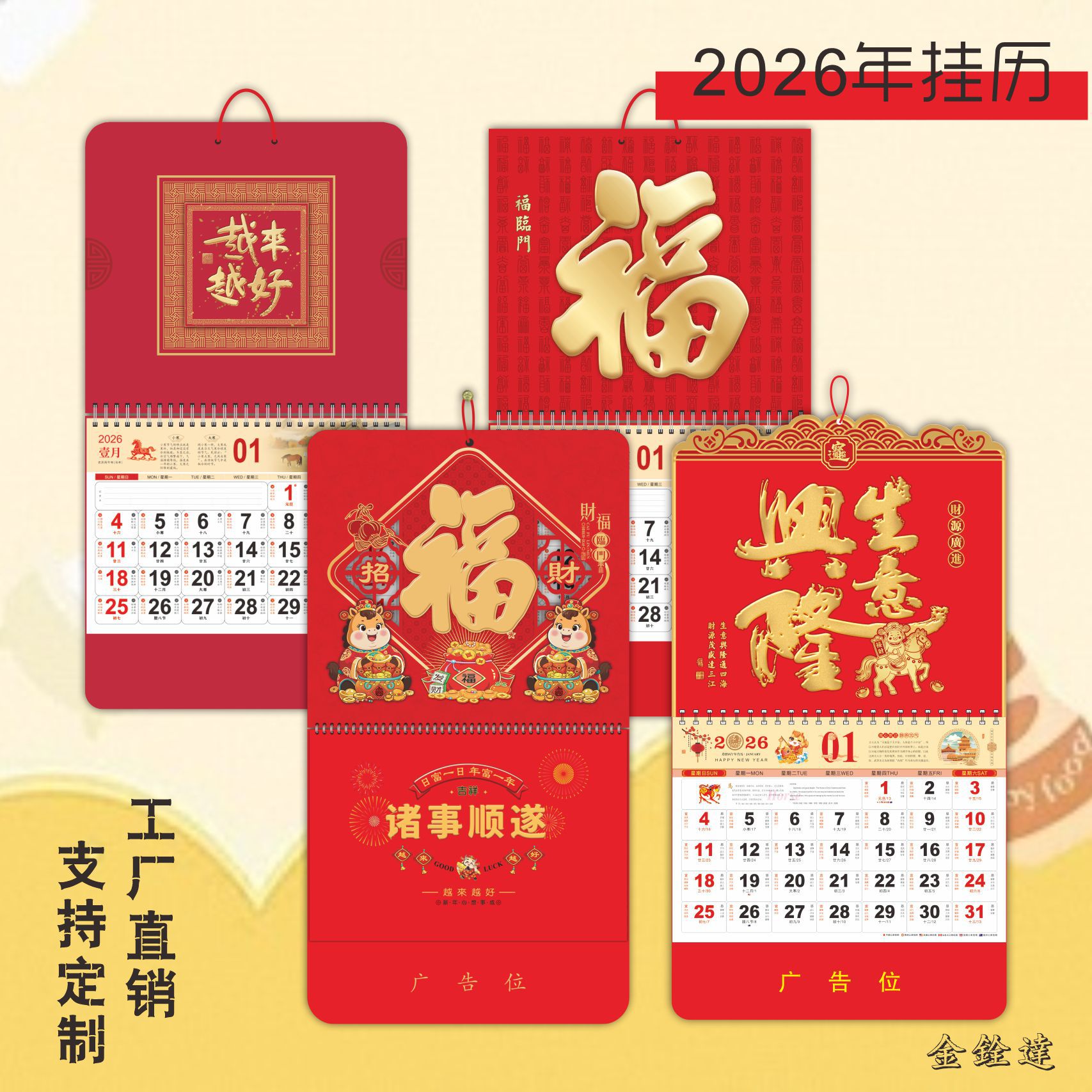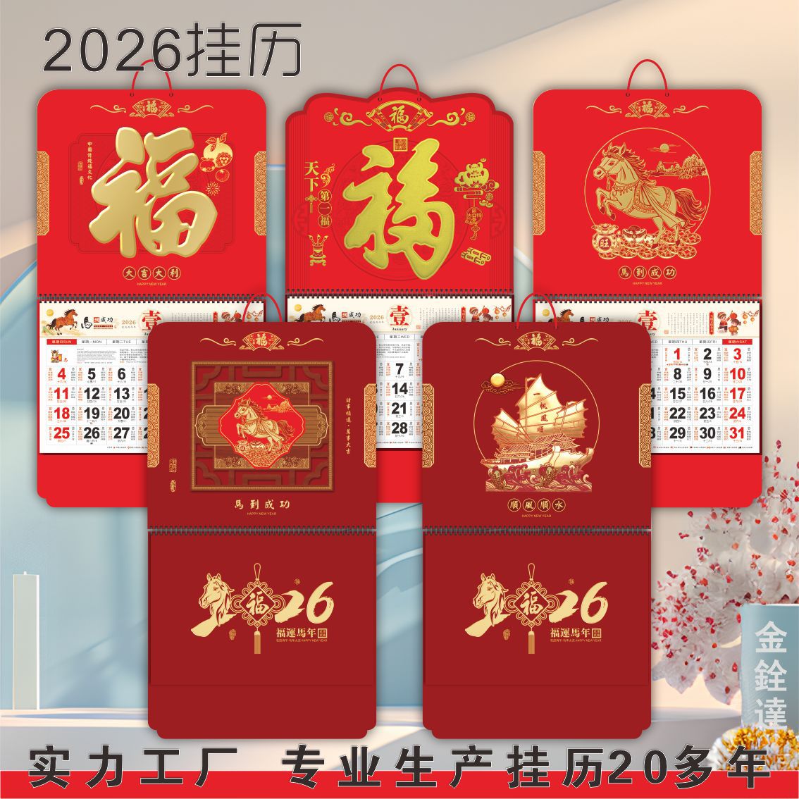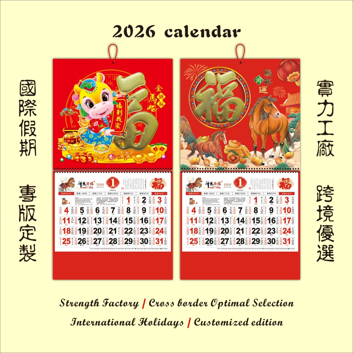 カレンダー2026馬年正六開福字吊り札専用版箔押し広告国際休暇財神生肖カレンダー
