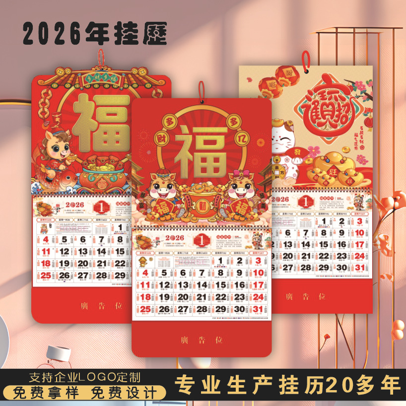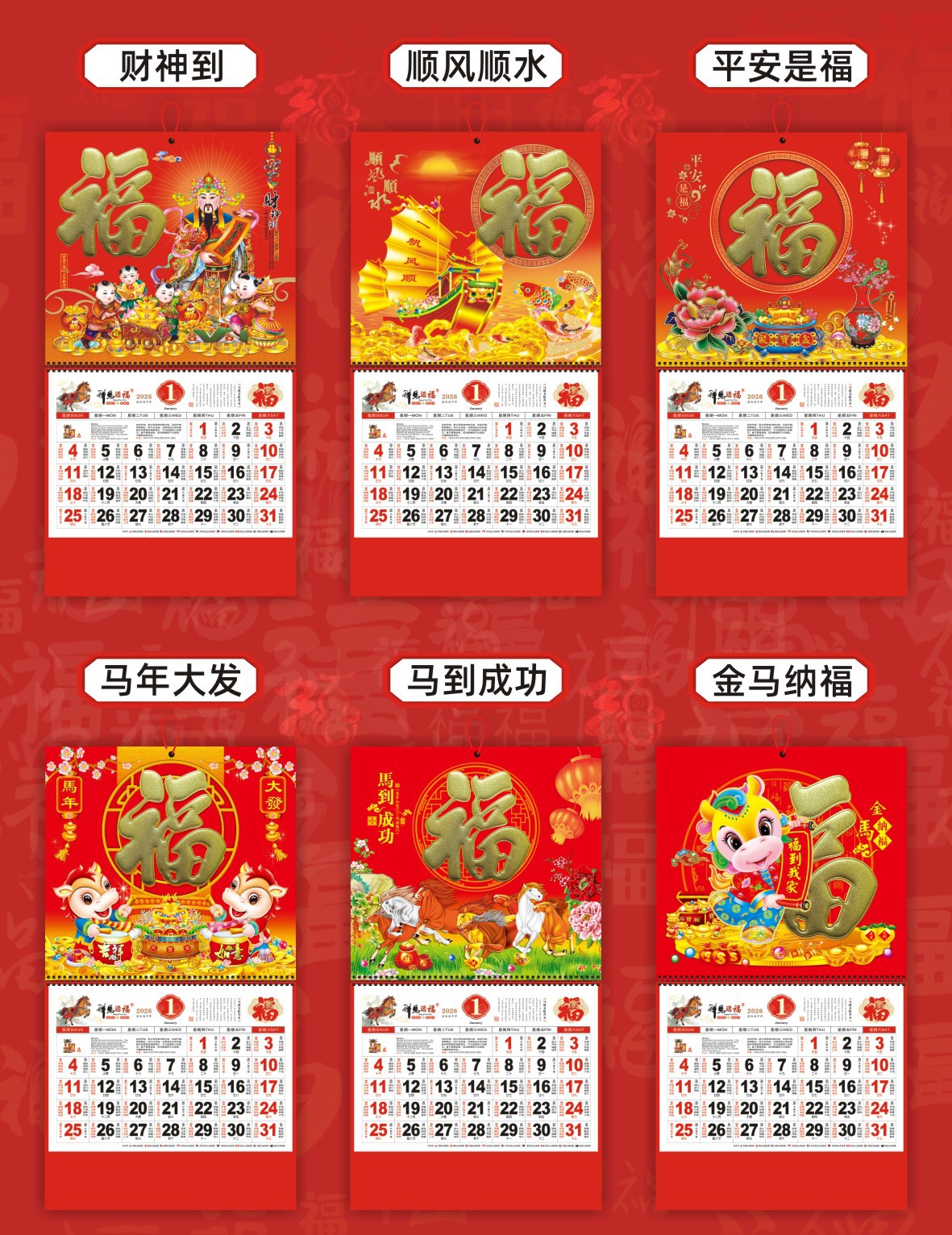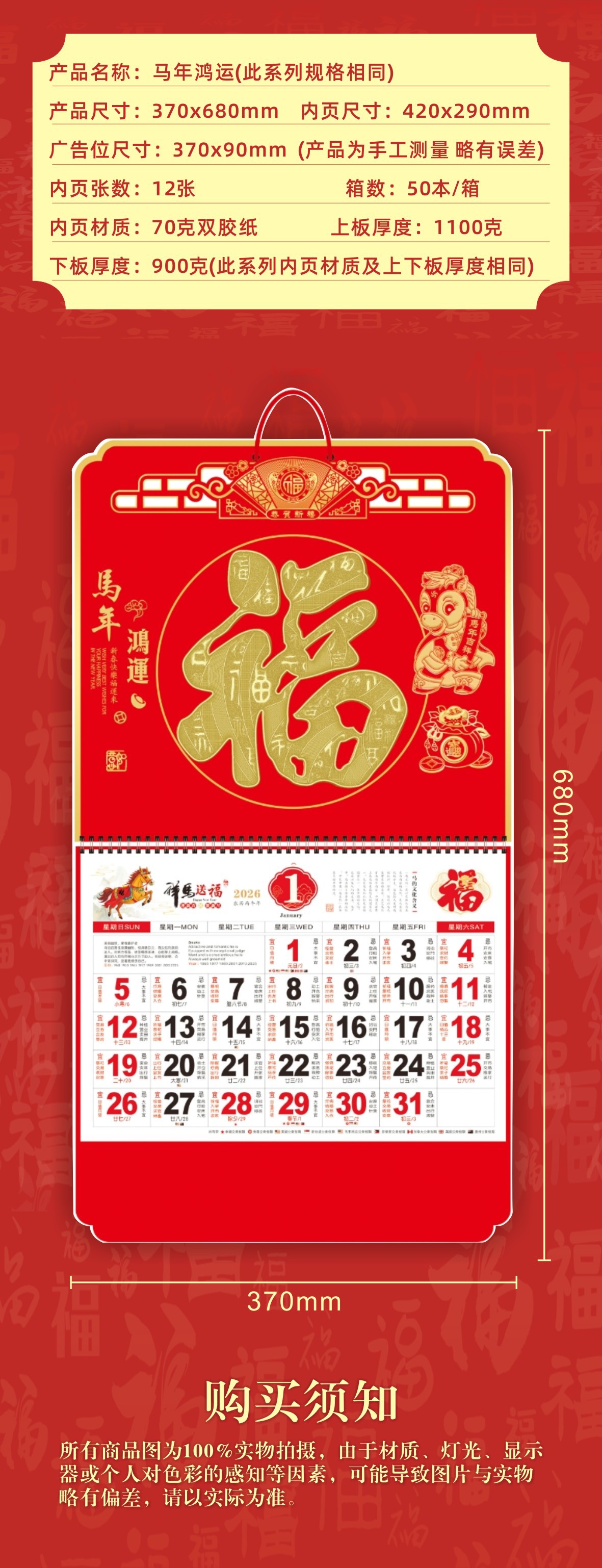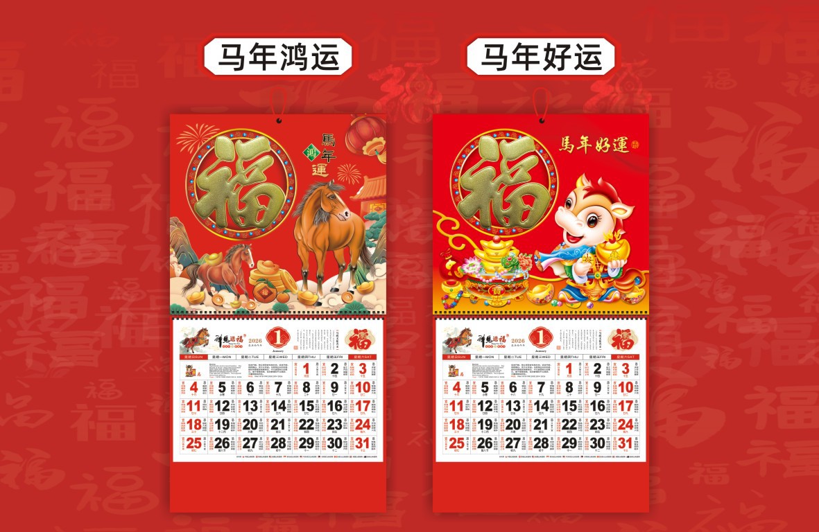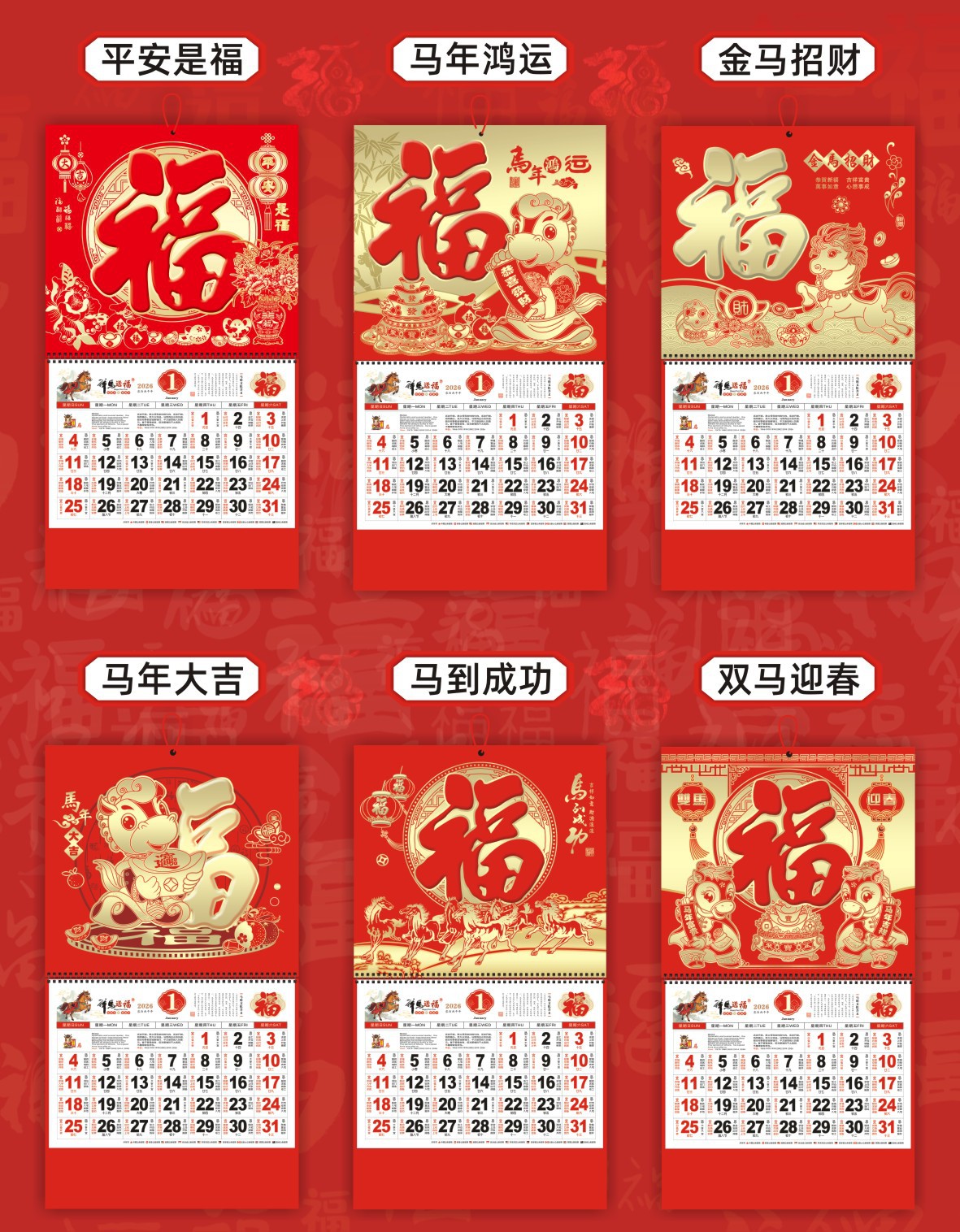 カレンダー2026馬年正六開福字吊り札専用版箔押し広告国際休暇財神生肖カレンダー