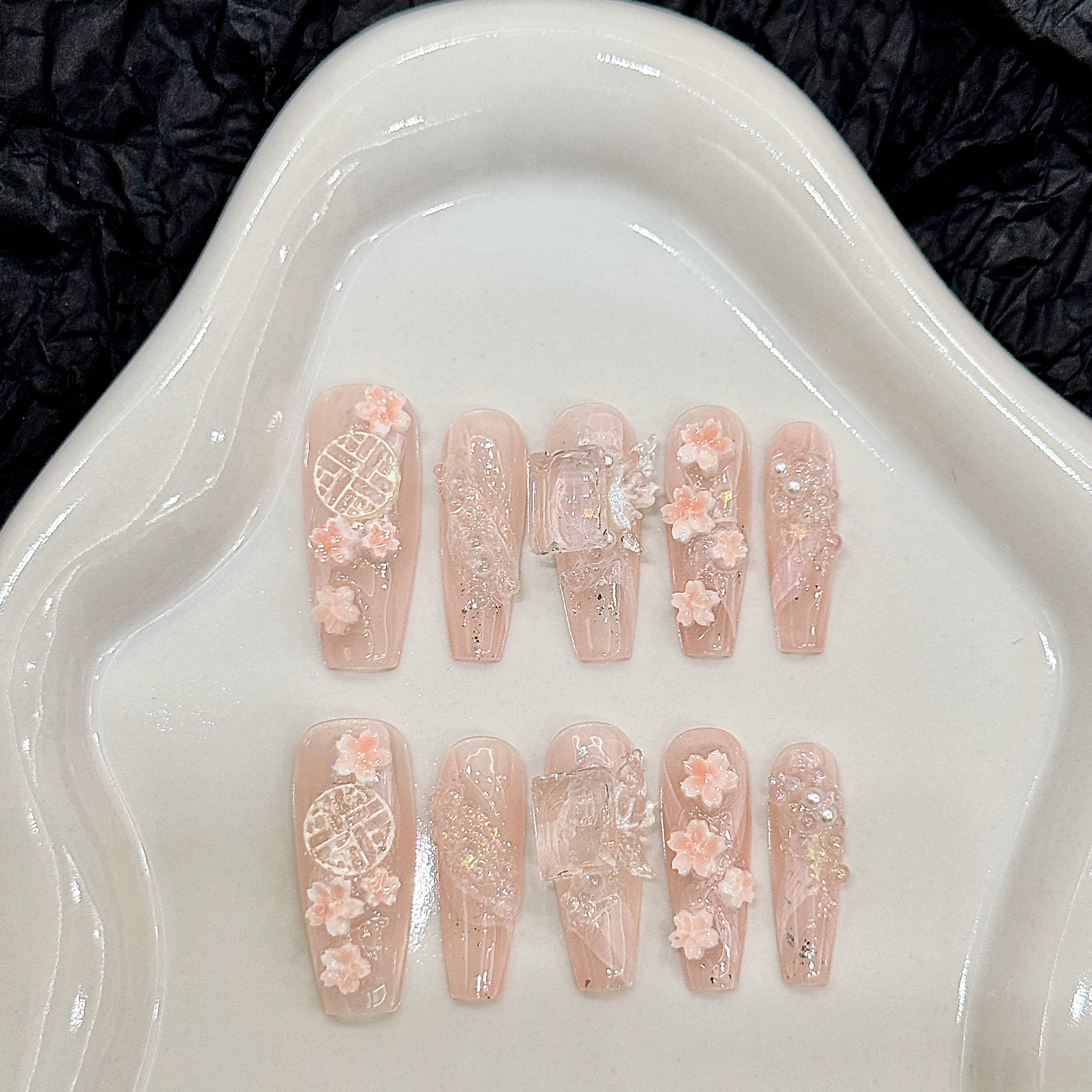 純粋な手作りのネイルは甲の爪を着て高級な軽い豪華な頬紅を貼って、蝶結びの氷が透き通っています。