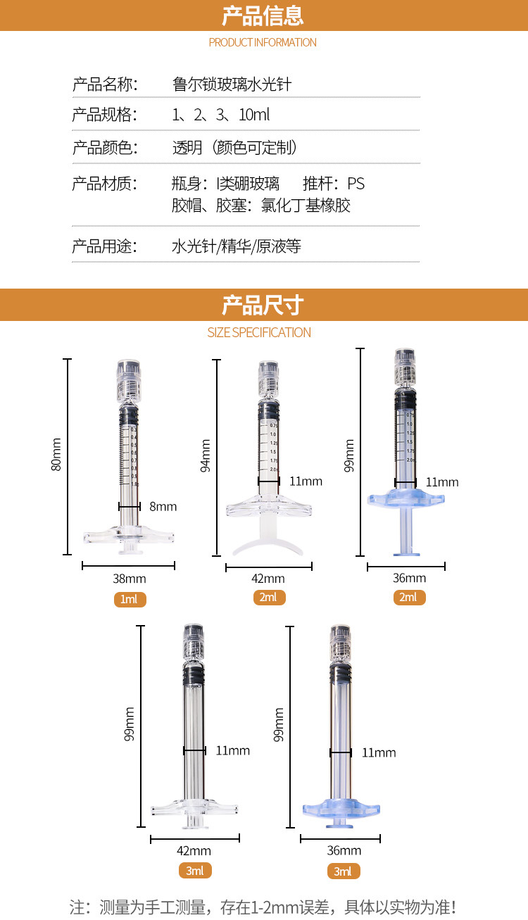 1ml美容水光针2/3ml预灌封带刻度玻尿酸精华玻璃注射器鲁尔锁现货